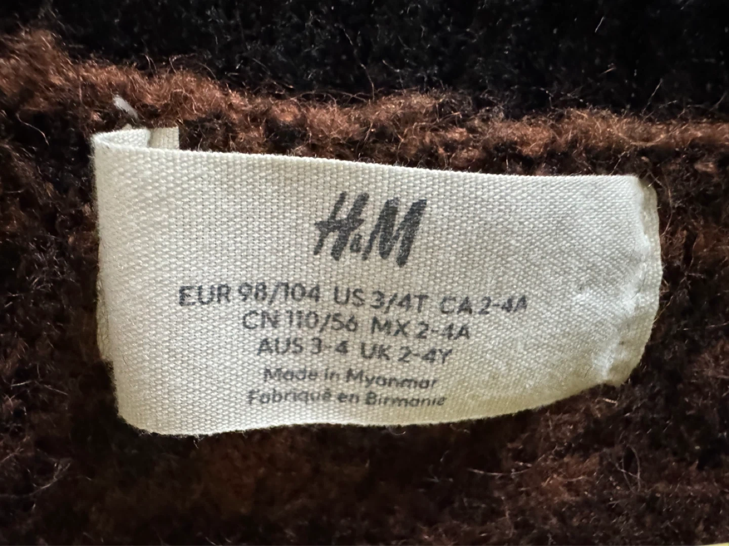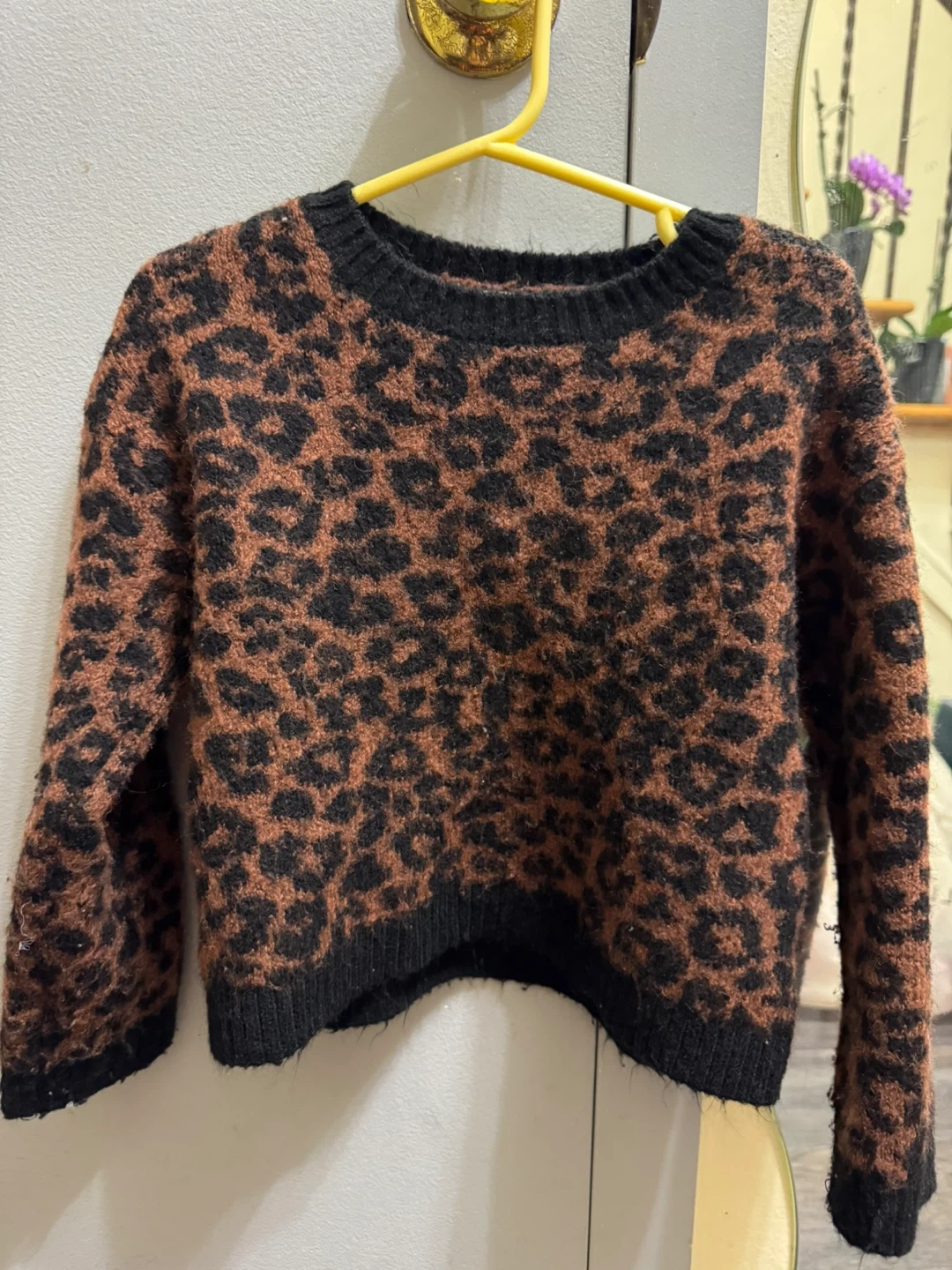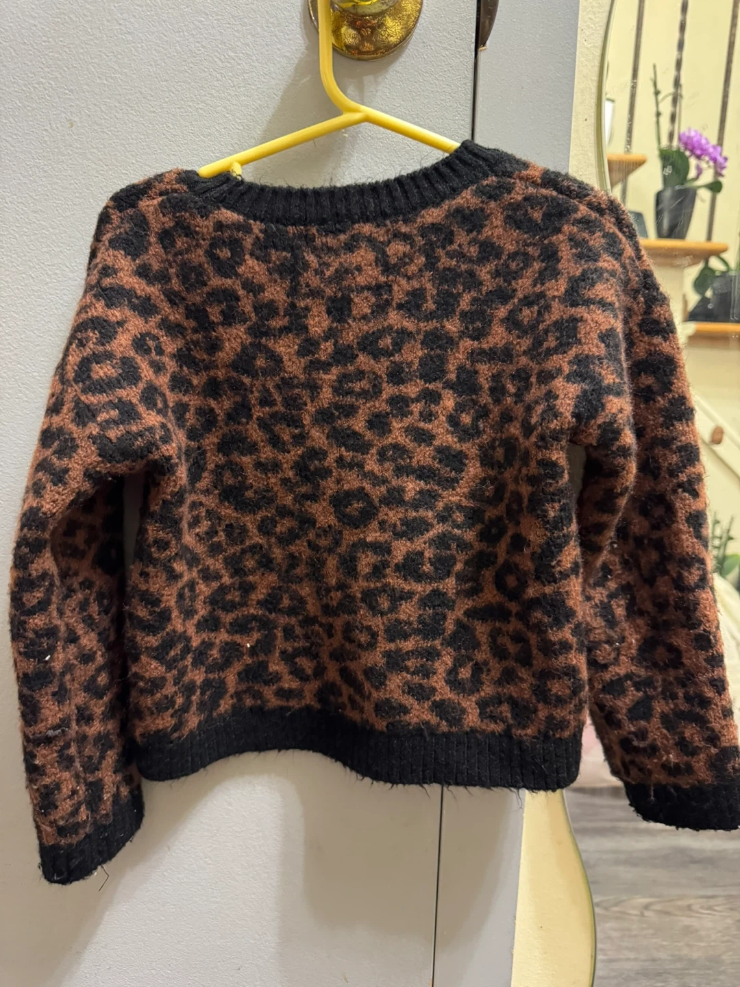 This H&M sweater features a fun leopard print. It's sized 3/4T, making it a great addition for a kid's wardrobe. The material looks soft and cozy for cooler weather.