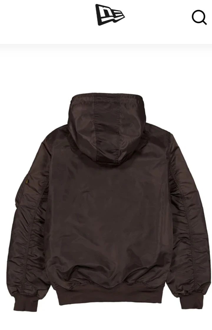 Check out this cool Alpha Industries bomber jacket in collaboration with New Era! It's a stylish brown color and features a hood for extra warmth. Perfect for adding a sporty touch to your outfit!