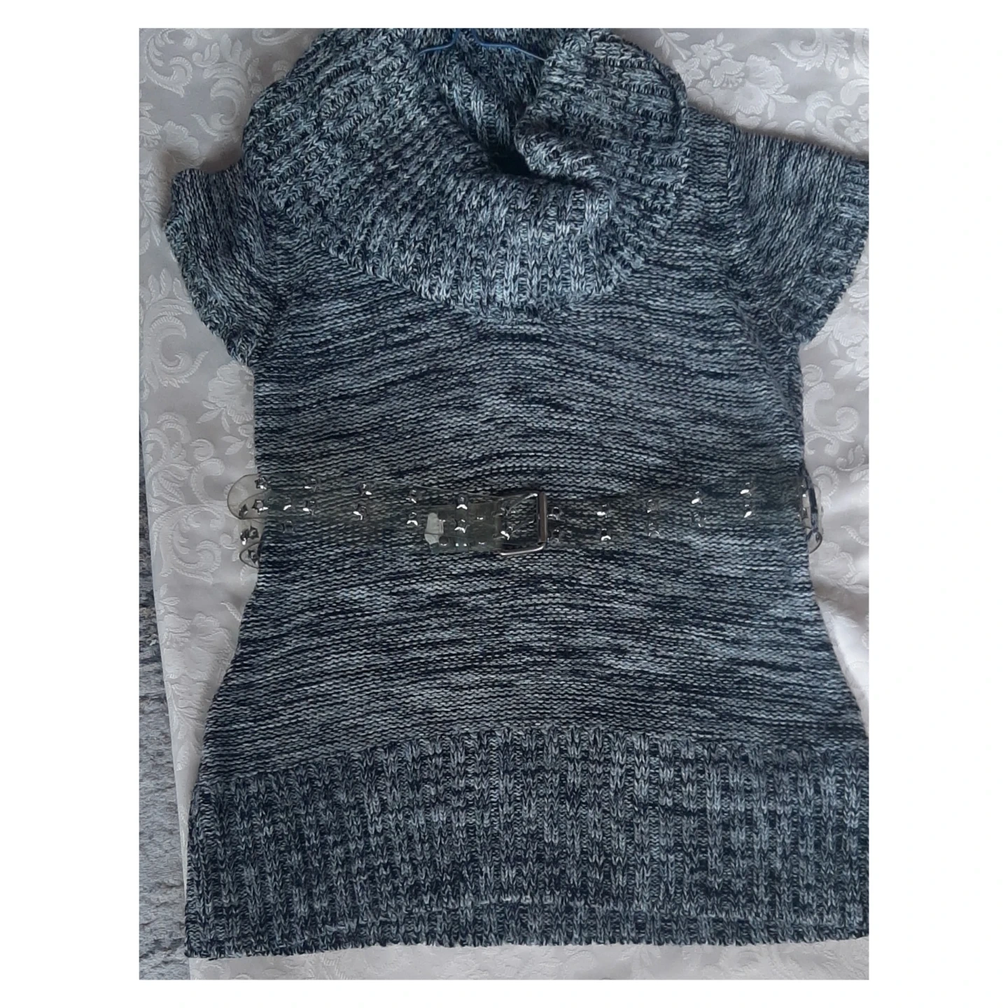 This is a women's short sleeve knit tunic sweater with a cowl neck. It features a marled grey and black knit pattern. Belt not included ,the sweater's material is a blend of acrylic and polyester, offering warmth and comfort.