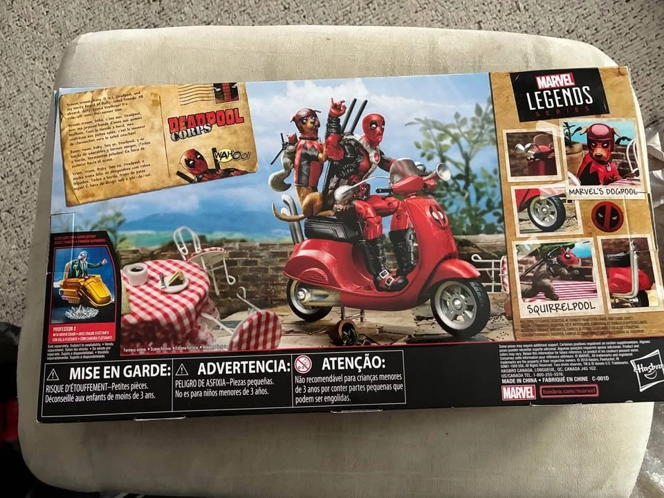 This is a Marvel Legends Ultimate Riders Deadpool Corps with Scooter action figure set. It is a 6-inch scale collectible set. The set includes action figures of Deadpool, Dogpool, and Squirrelpool, along with a scooter and Bob's head accessory. It was released as part of the Marvel Comics 80th Anniversary celebration. The figures are highly articulated and designed to resemble the characters from the comics. The manufacturer is Hasbro. Sells on eBay for over $100 (see attached photo).