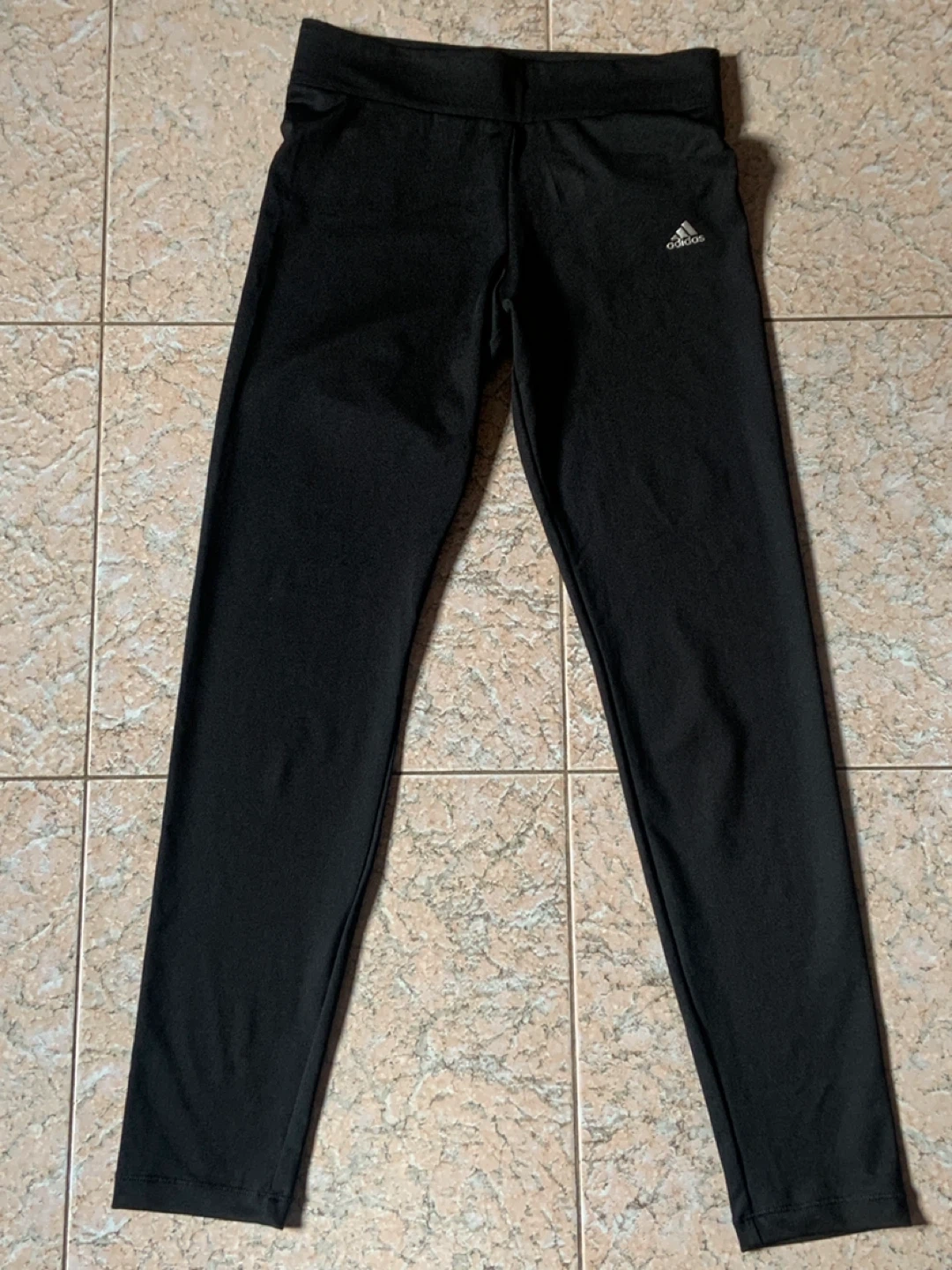 These black Adidas leggings are great for athletic activities. They're made from a comfortable fabric and feature the iconic Adidas logo on the side. Perfect for workouts or casual wear!