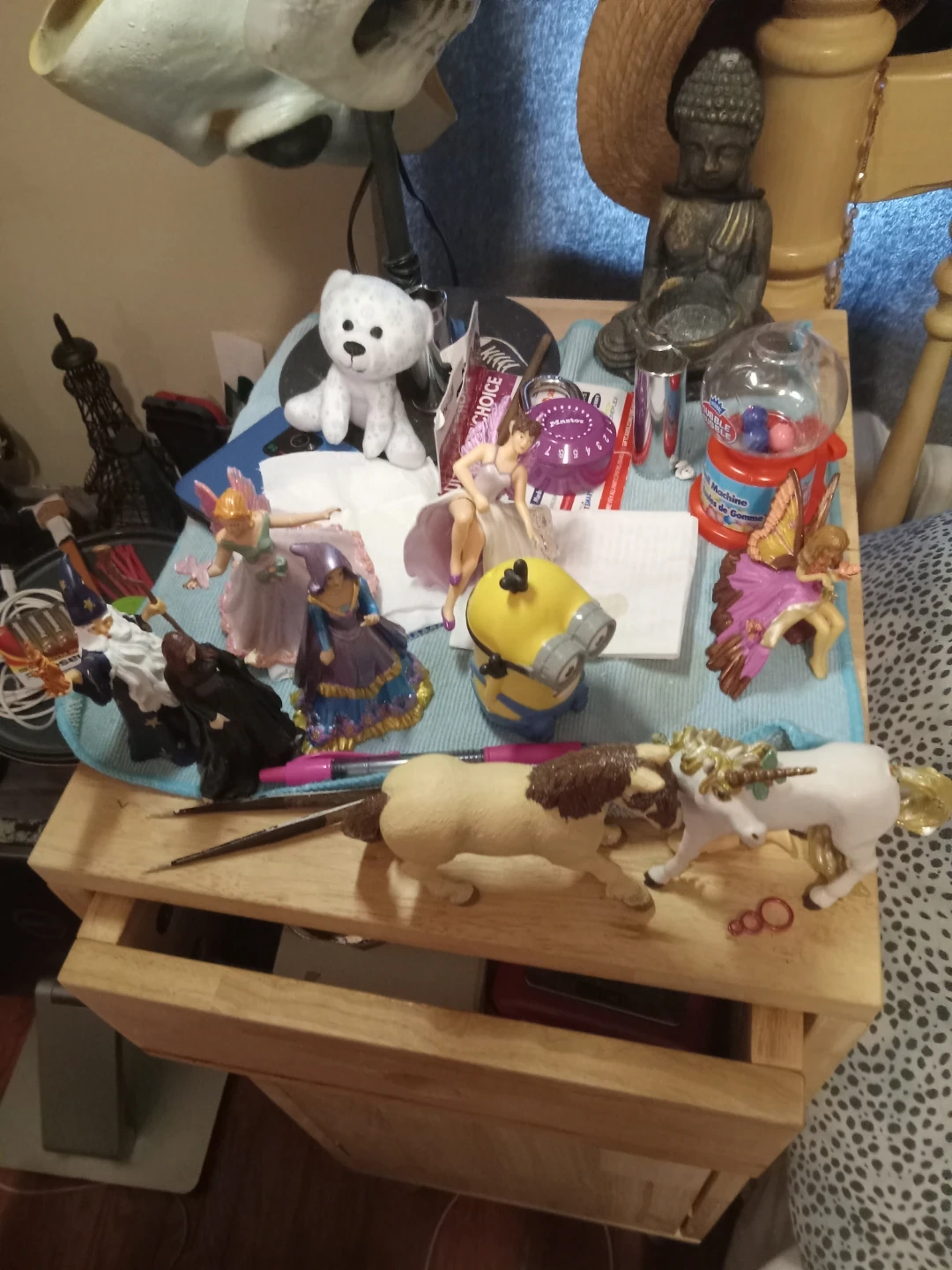 Collection of small figurines including fairies, a unicorn, a horse, a teddy bear, and a Minion toy. Also includes a gumball machine and a small Buddha statue. Great for playtime or display!
