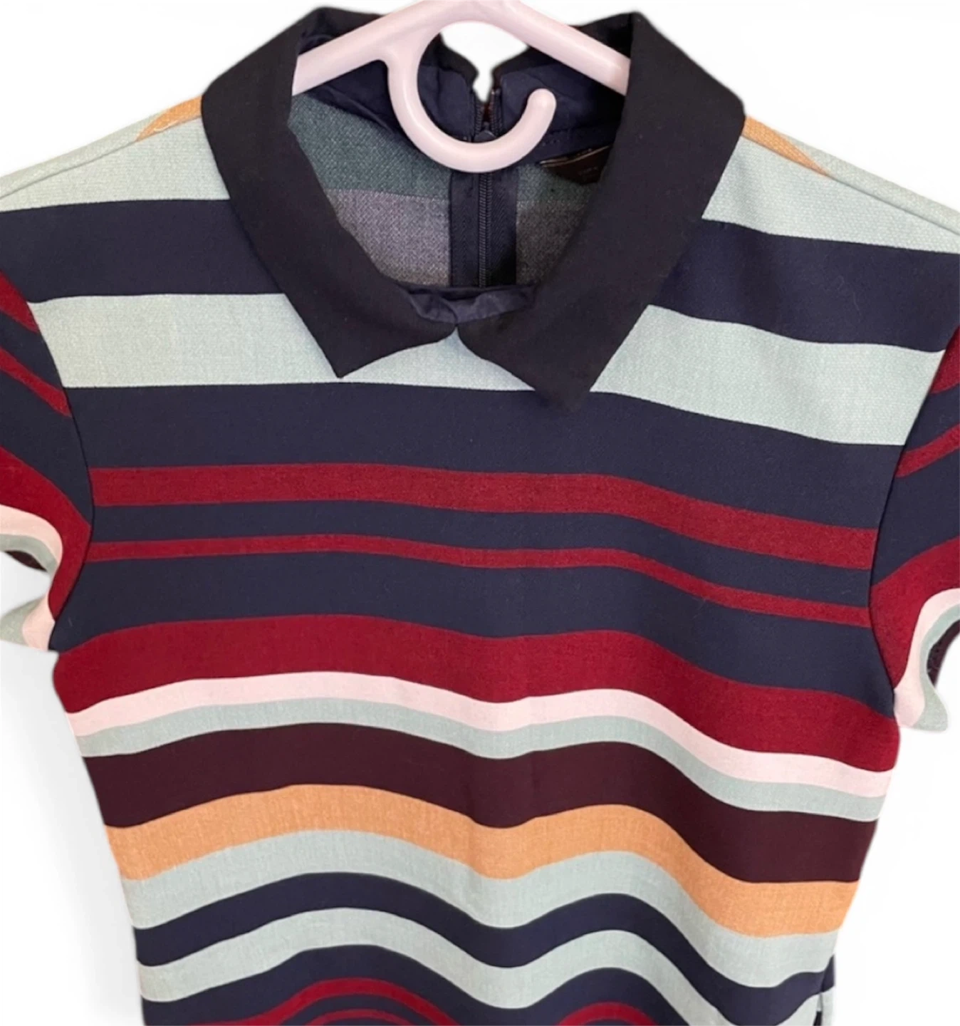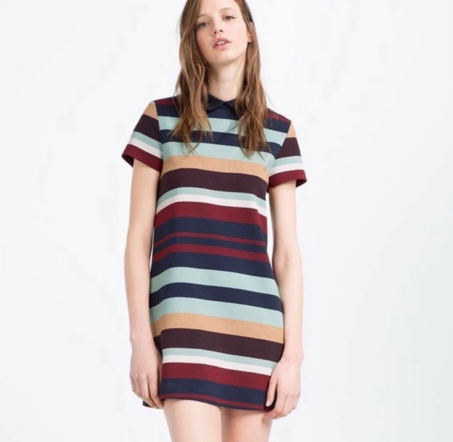 ZARA Trafaluc collection, shift-style mini dress with horizontal stripes in multiple colors including: burgundy, navy, light blue, and tan.
