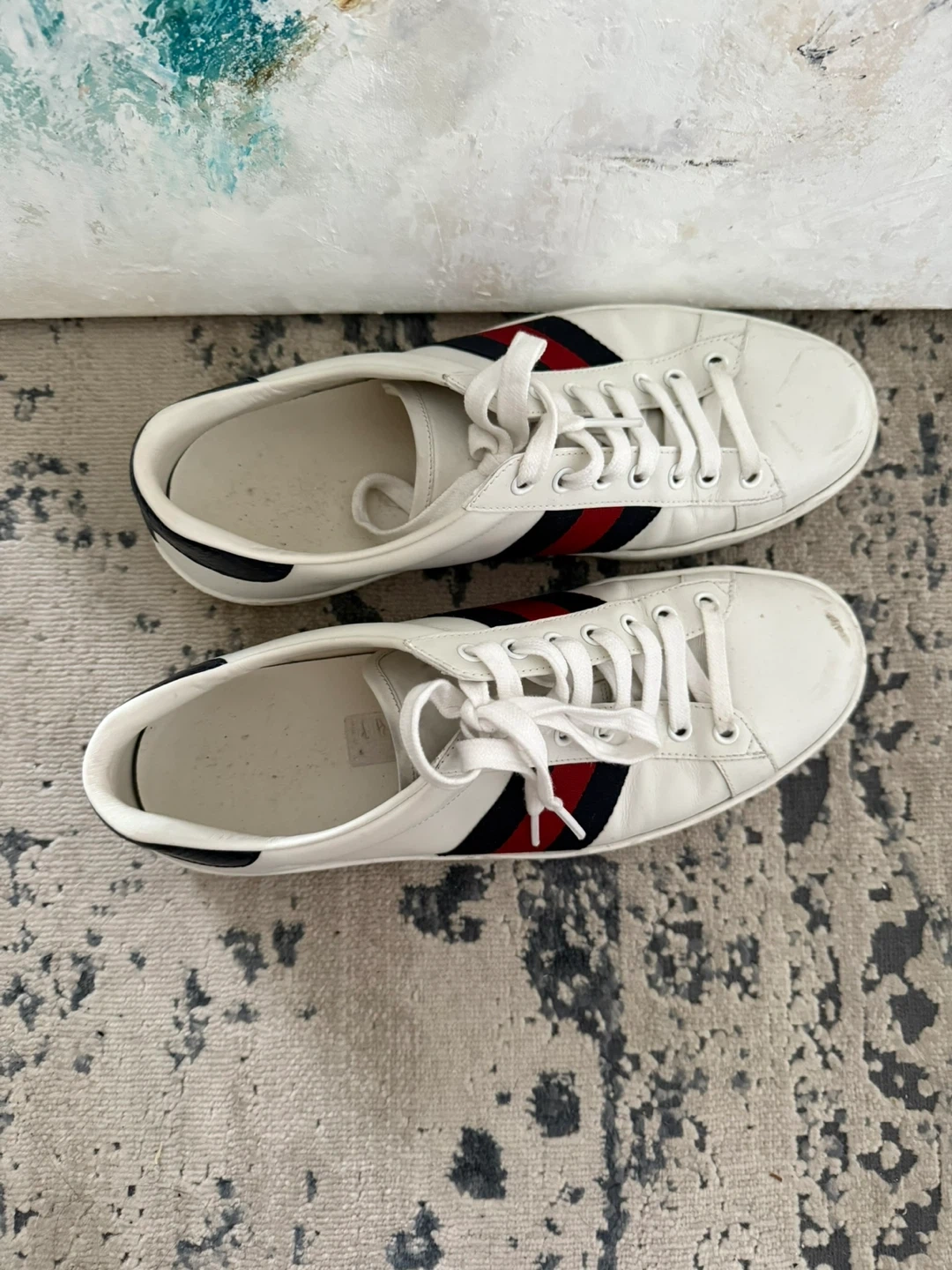 Gucci White Leather Sneakers with Red and Blue Stripes