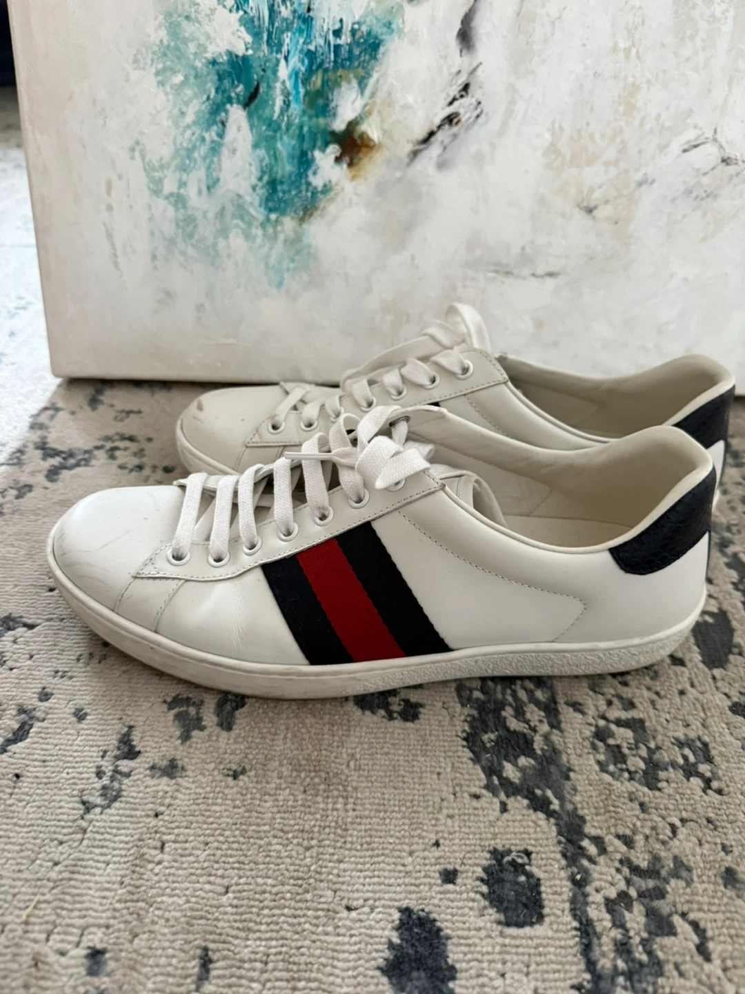 Classic white leather sneakers from Gucci. Features the iconic red and blue stripe detail on the side and navy accent at the heel. Lace-up closure for a secure fit. These are a stylish addition to any casual outfit!