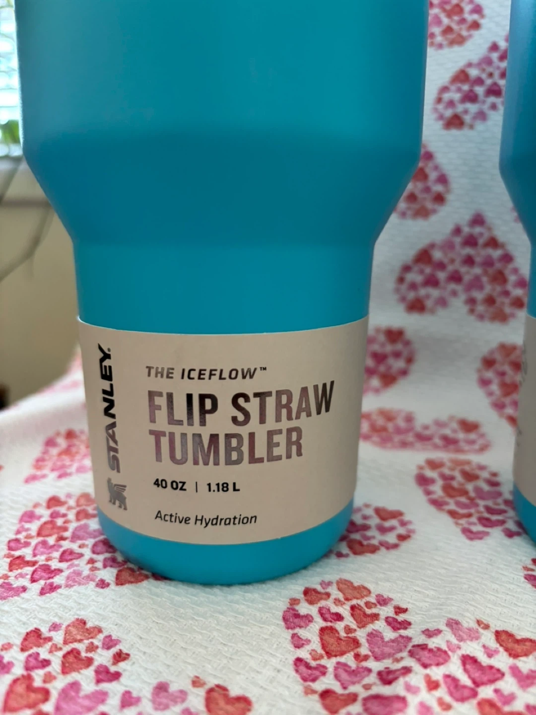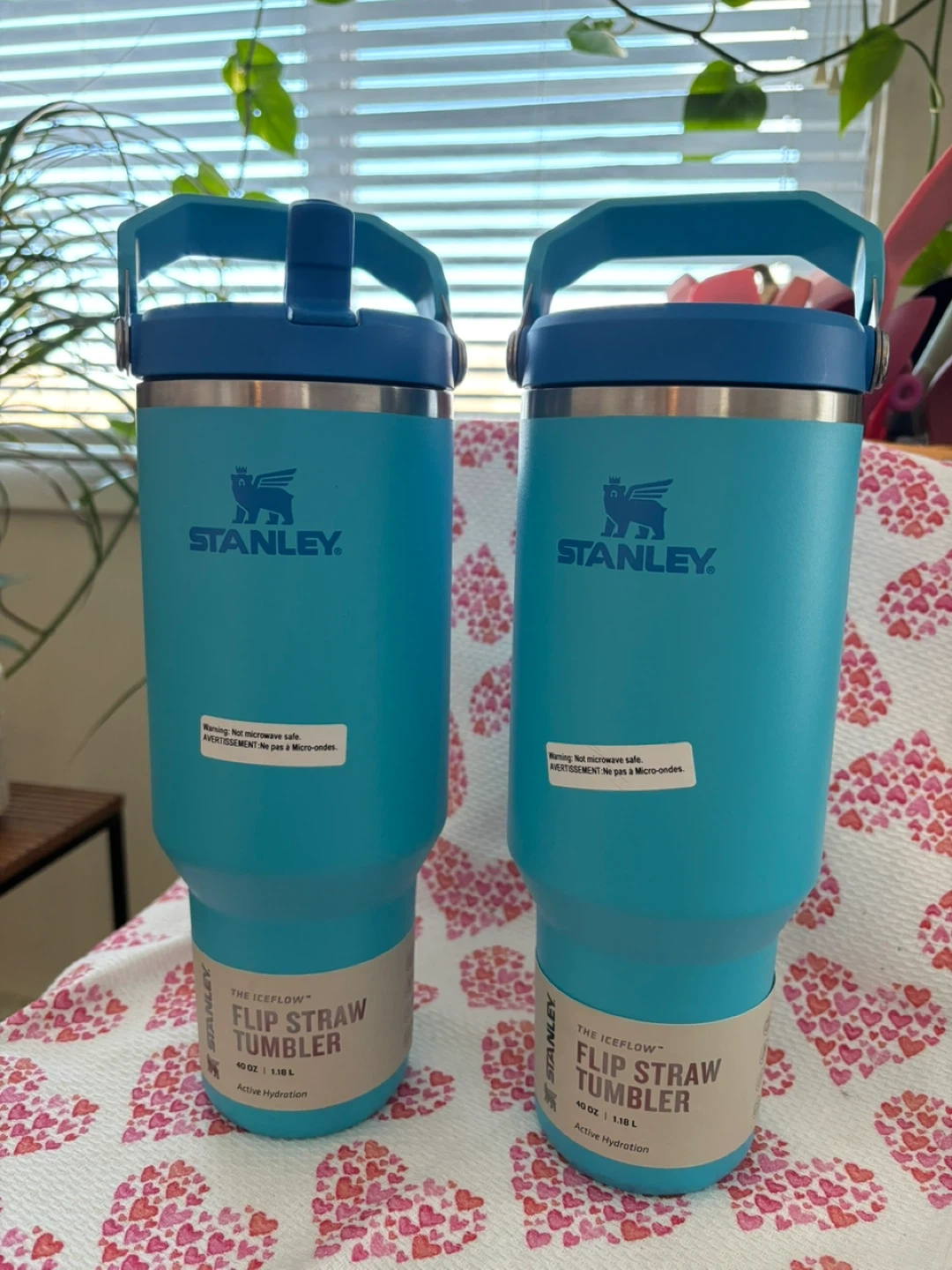 Two Stanley IceFlow Flip Straw Tumblers included. They hold 40 oz (1.18 L) each and are designed for active hydration. These tumblers are great for keeping drinks cold on the go!