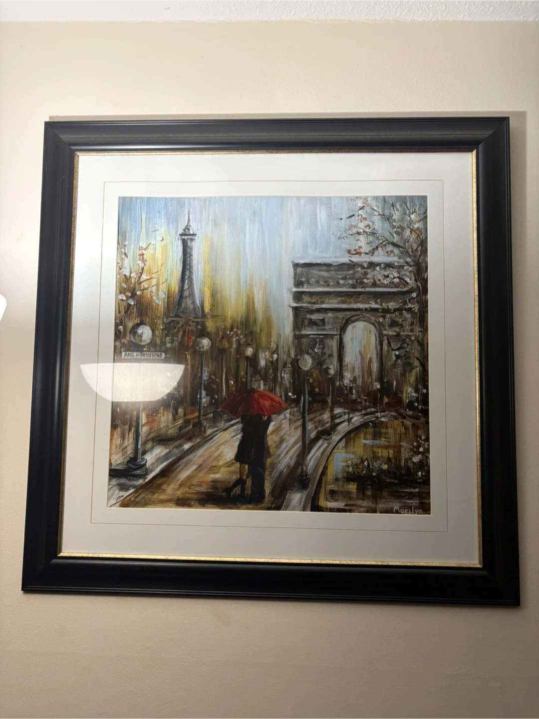 Beautifully framed painting depicting a romantic Paris street scene with the Eiffel Tower and Arc de Triomphe. Features a couple with a red umbrella. The artwork is signed by 'Marilyn'. It's a lovely piece to add to your decor.