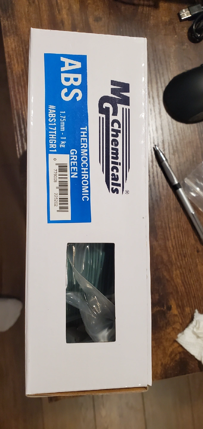 Selling a new roll of MG Chemicals ABS Thermochromic Green 3D printer filament. It's 1.75mm and 1 kg. The box is included!