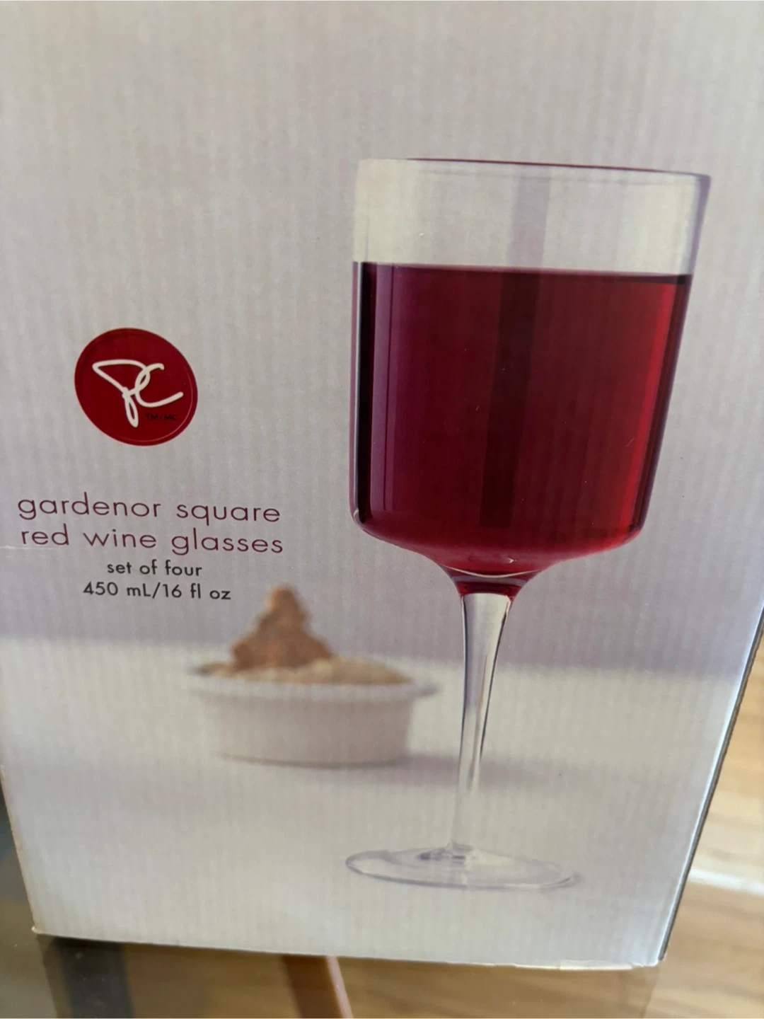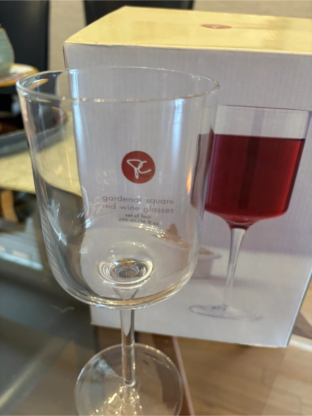 Brand new set of four PC Gardenor Square red wine glasses. Each glass holds 450 ml or 16 fl oz. These stylish glasses are perfect for enjoying your favourite red wine!
