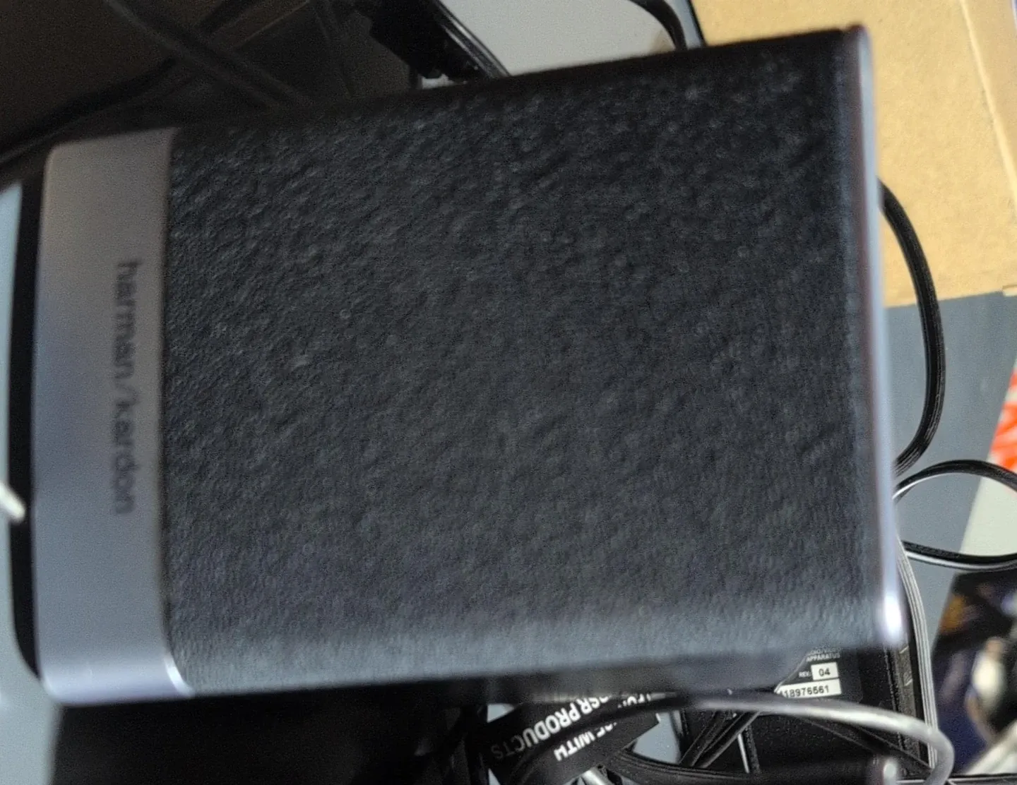 Compact Harman Kardon computer speakers for your desktop setup. They're designed for clear audio output. Power requirement is 12V --- 1.0A. Comes with all necessary cables.
