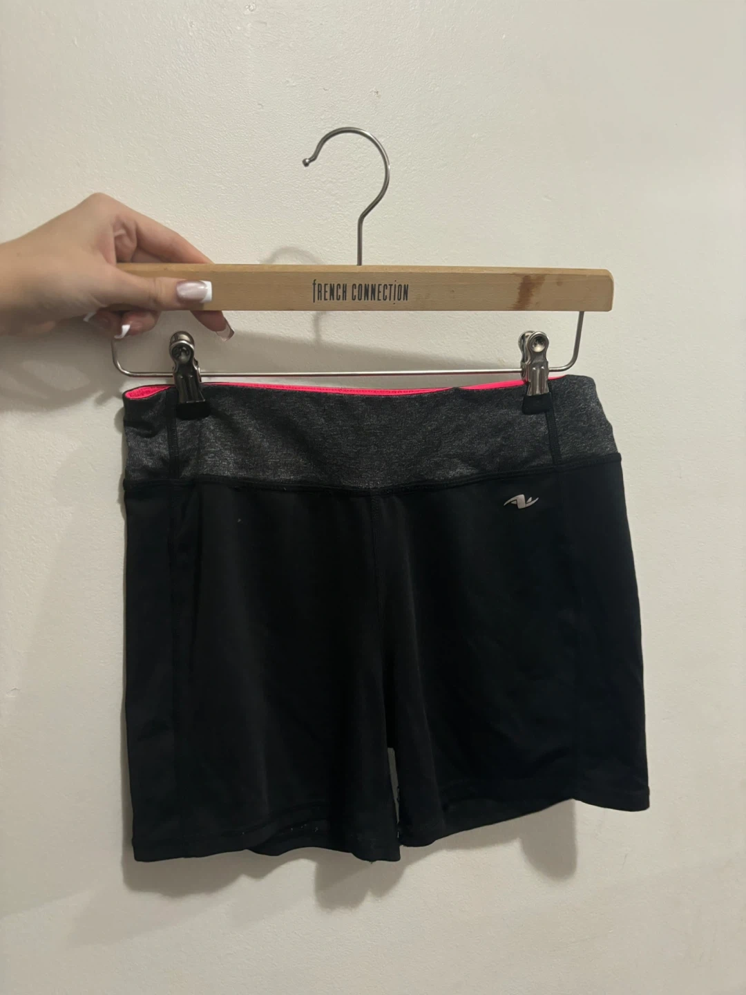 Black athletic shorts with a grey and pink waistband. These shorts are made for active wear. It's a size medium. Perfect for running or gym workouts!