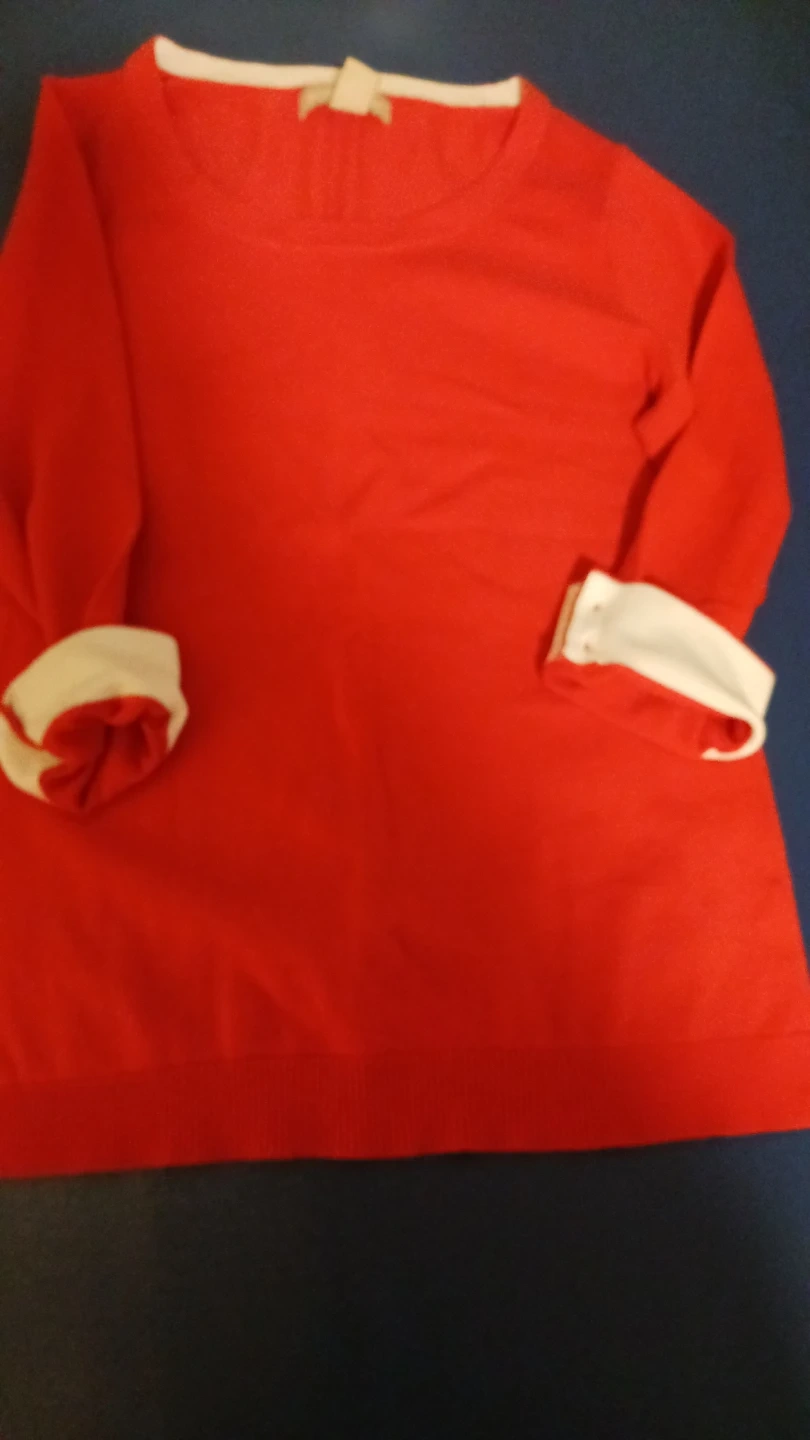 Banana Republic women's sweater in a vibrant red hue. It features 3/4 length sleeves and0000000009 white cuffs and collar detail. Size medium. Material is 40%cotton and 60% acrylic. Never worn! Karrot suggests $10 - $15