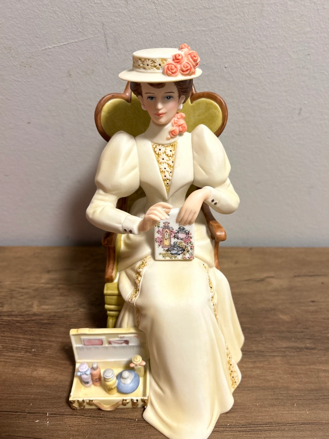 This is an AVON President's Club award figurine from 2011-2012. It depicts a woman sitting in a chair with a makeup case and perfume bottles. The figurine is made of ceramic.