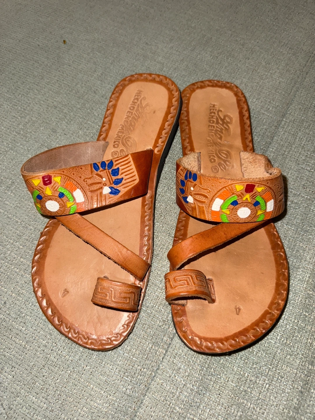 These are handmade leather sandals with colorful beaded details and a traditional Greek key embossed design on the toe strap. They're made in Mexico and feature a slip-on style with a toe loop. Size 4.