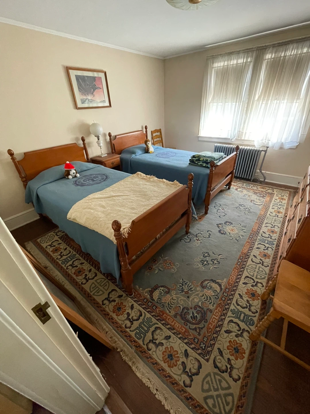 Two wooden twin beds in a classic design. Each bed comes with blue bedding and a complementary throw blanket. These beds are ready to provide a comfortable sleeping space. Found at uncles house, selling to cover funeral expenses