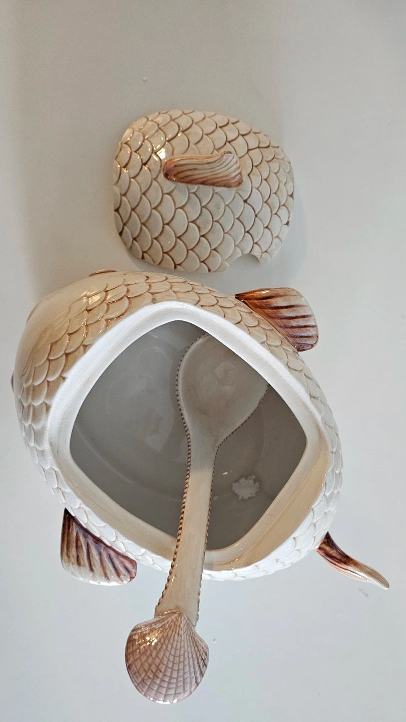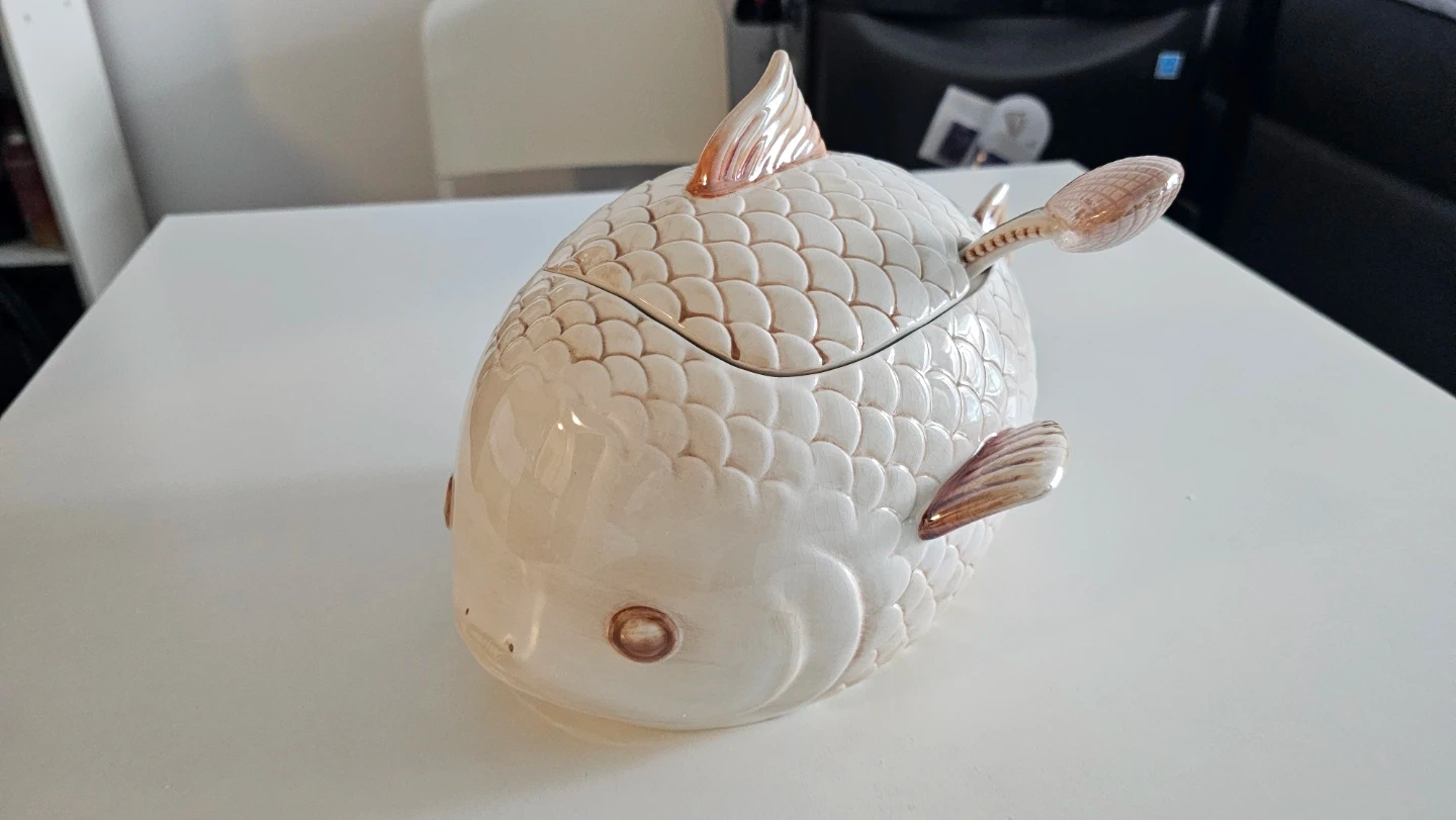 Selling a charming fish-shaped serving dish from By The Sea Naturals! It comes with a lid and a spoon, perfect for serving dips or sauces. The dish is in great condition and would make a lovely addition to any table setting. It also comes with the original box!