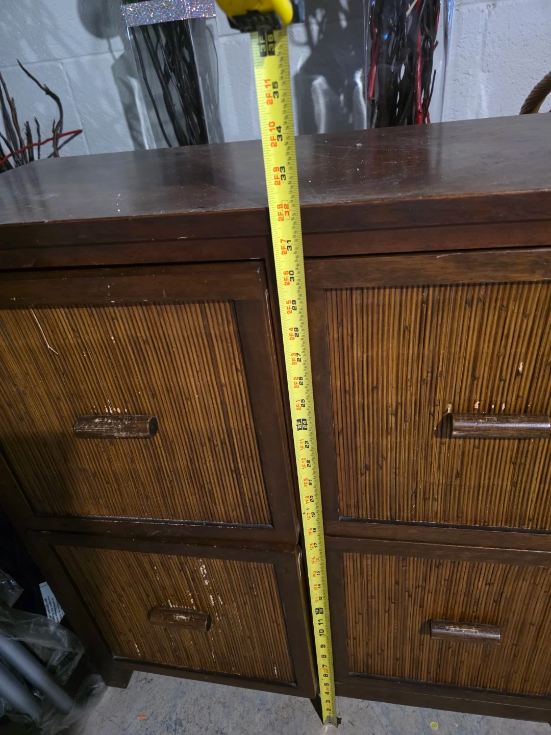 A charming wooden cabinet featuring four drawers with woven rattan fronts and wooden handles. It's stained a warm brown and has a lovely natural look. This piece measures approximately 30 inches in height. It's perfect for storing various items in any room!