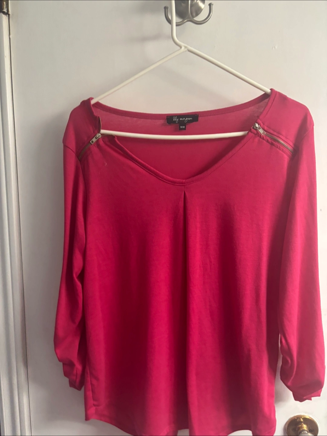 A lovely pink top from Lilly Morgan! It's a size medium and in great condition. The material is soft and comfortable, perfect for everyday wear. It features a unique design with zipper details on the shoulders. A stylish addition to any wardrobe!