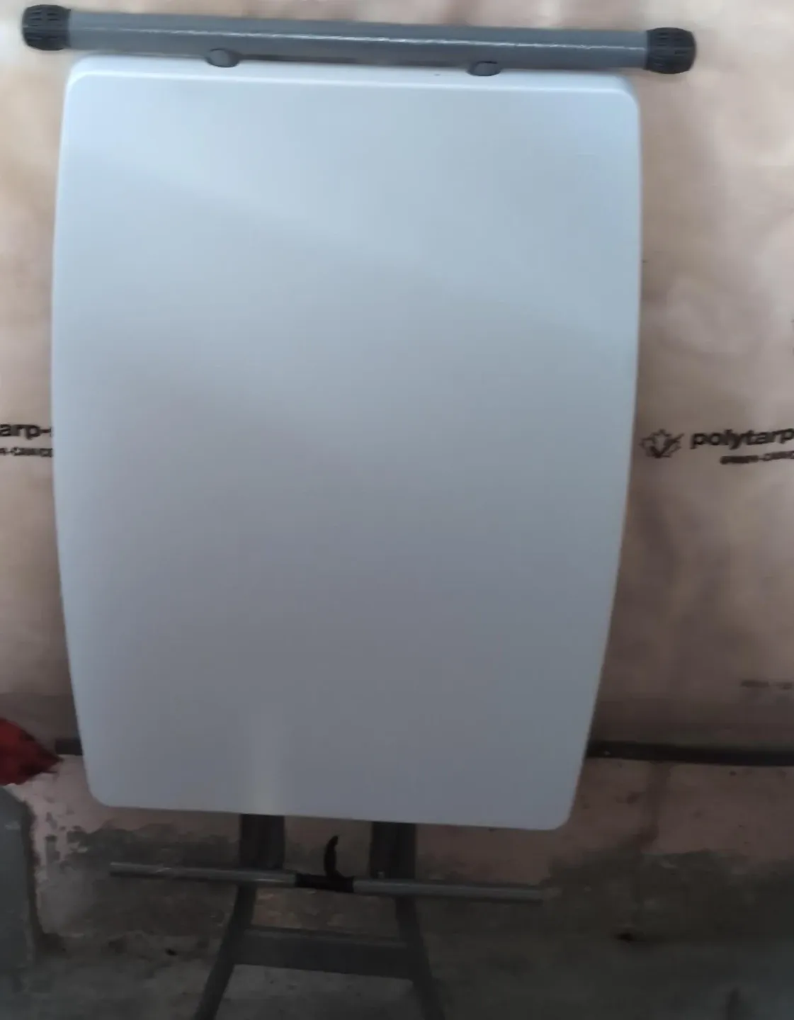 A white folding table with a metal frame. It's suitable for various uses, like parties, puzzles, crafts or extra workspace. This table folds for easy storage and transport!