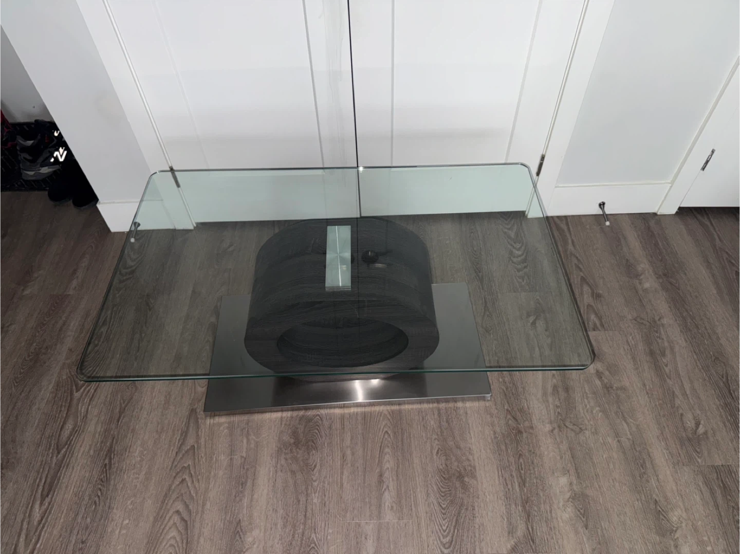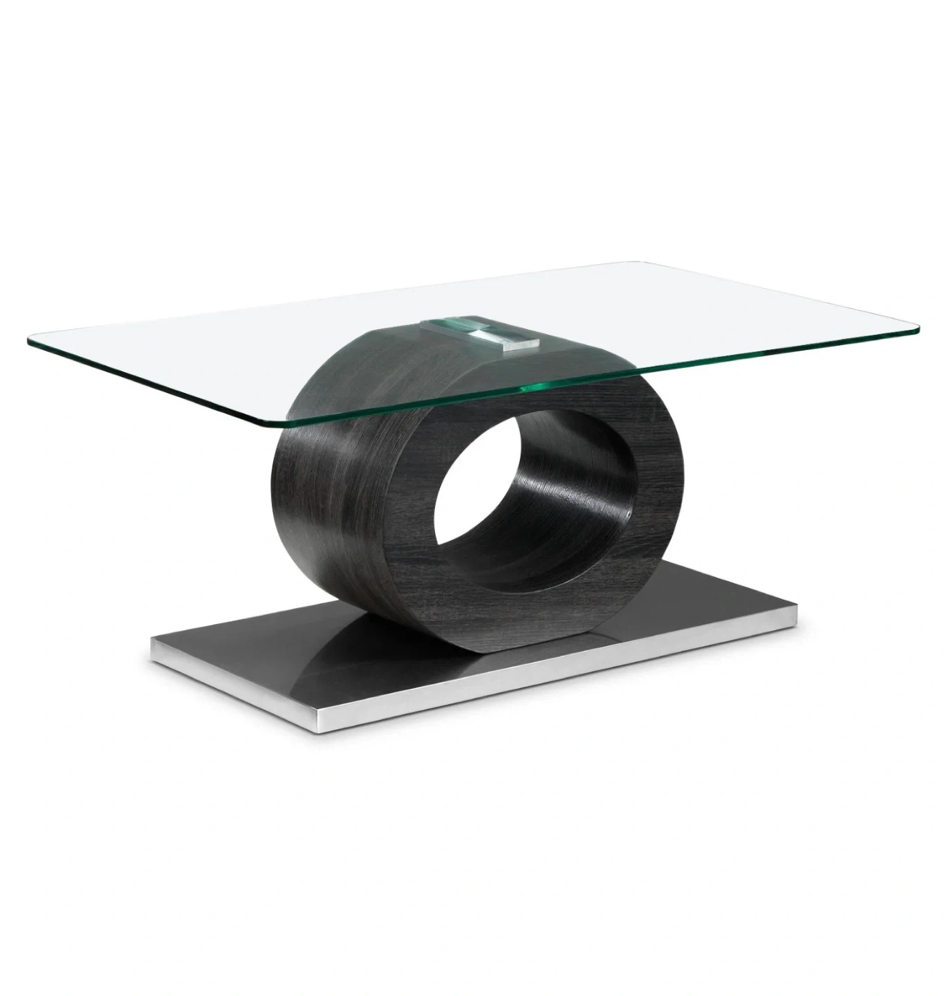Modern Glass Coffee Table with Unique Grey Wood Base