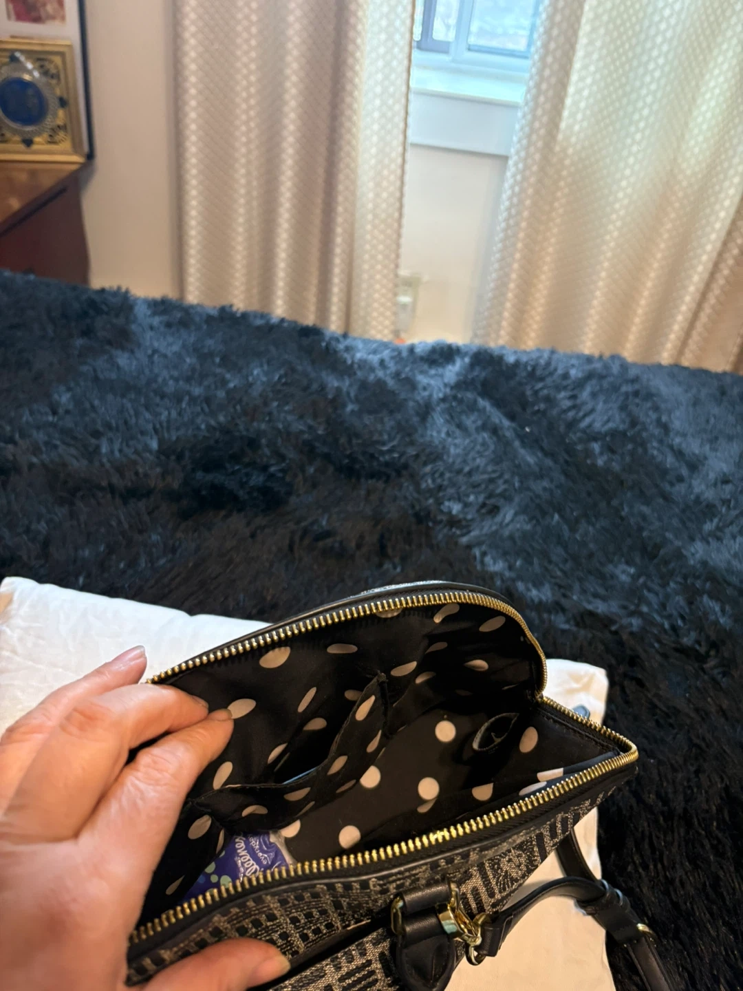 This Anne Klein dome satchel features a classic geometric pattern with black trim. It has a zip-top closure and an interior with polka dot lining. It's a stylish bag for everyday use!