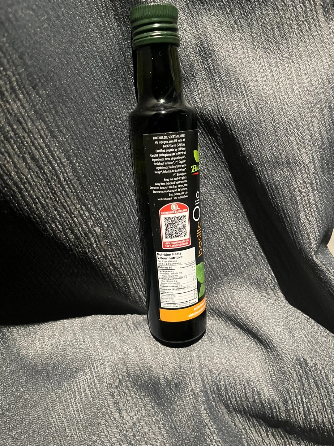 BioItalia organic basil extra virgin olive oil. 250ml bottle. Best before date is 2028 Jan 21.