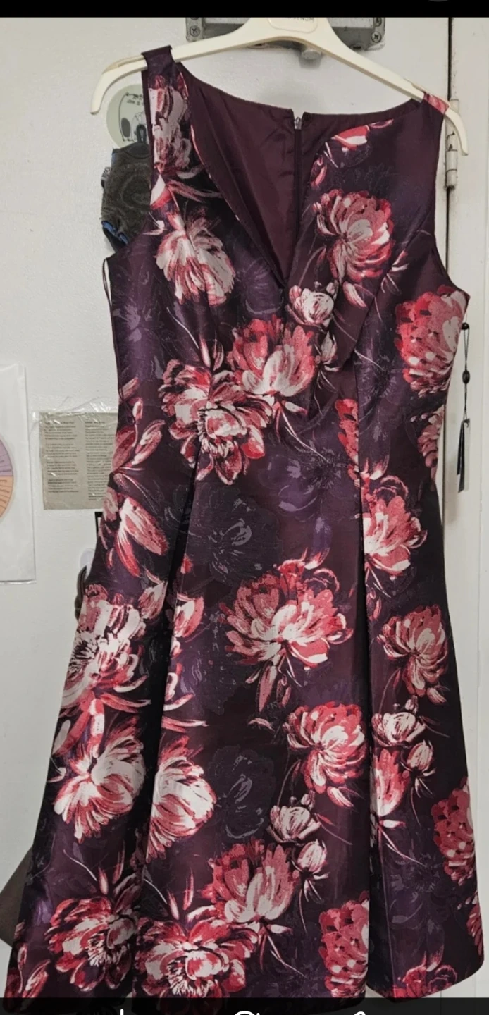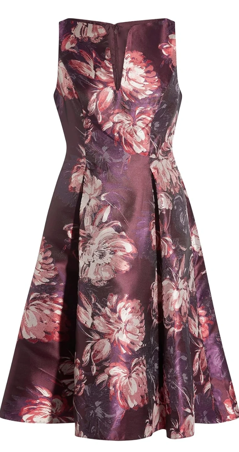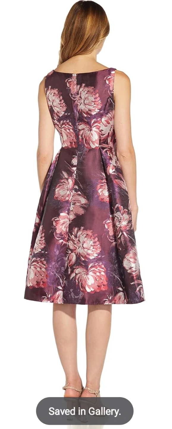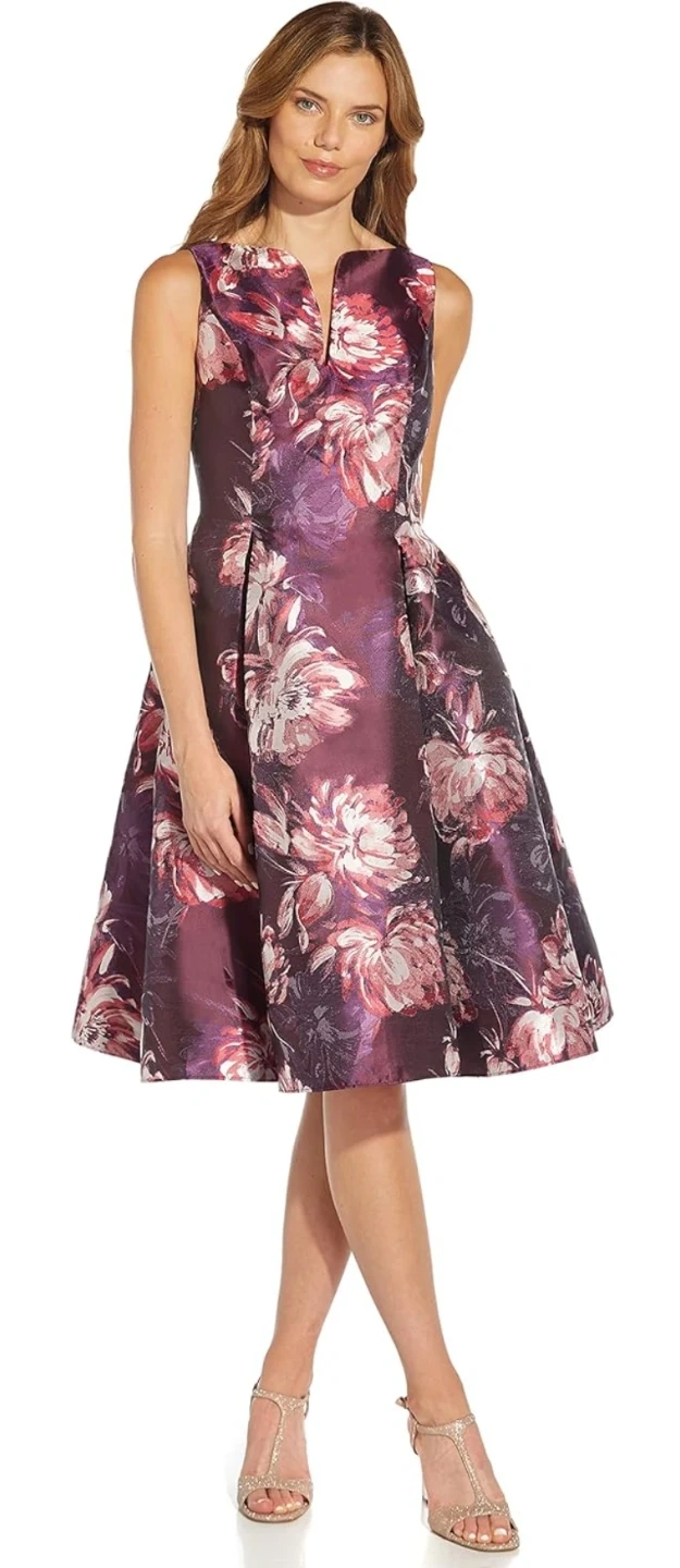 Selling a beautiful Adrianna Papell fit and flare jacquard dress! The dress is a size 10 and features a purple multi colour. The style number is AP1D104589 and the colour code is AA590. Retails for $179.00