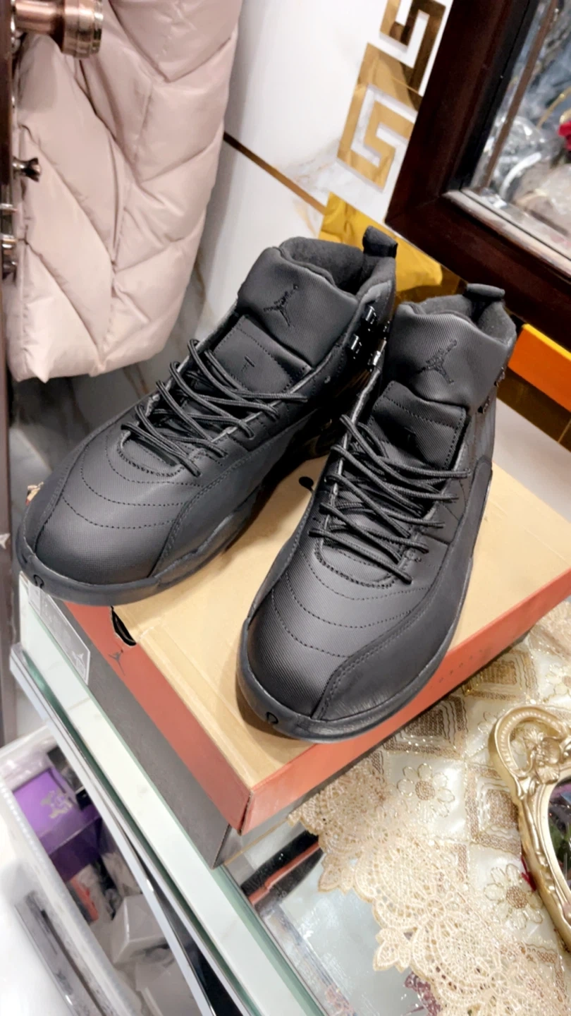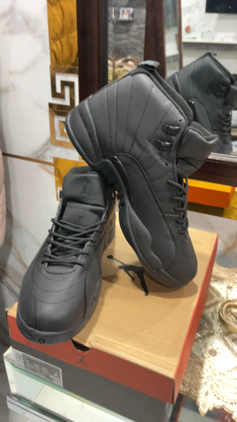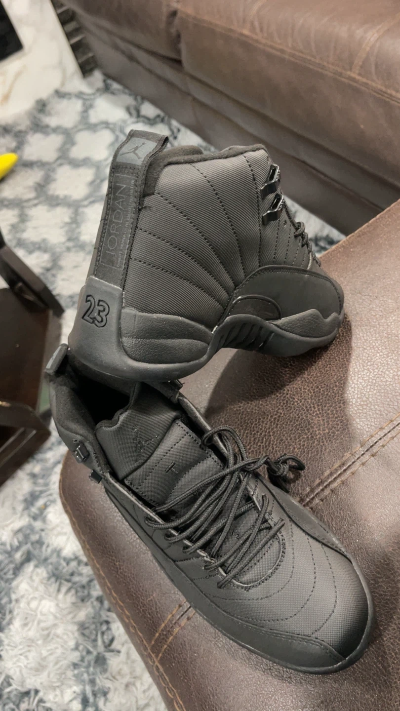These are black Air Jordan 12 Retro sneakers. They feature a high-top design with laces and the Jordan logo. Comes with the original box. Size 10, 11, 12