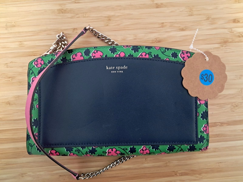 Adorable crossbody bag. Features a navy blue flap and a green floral print. Gold chain strap. Pink accents.