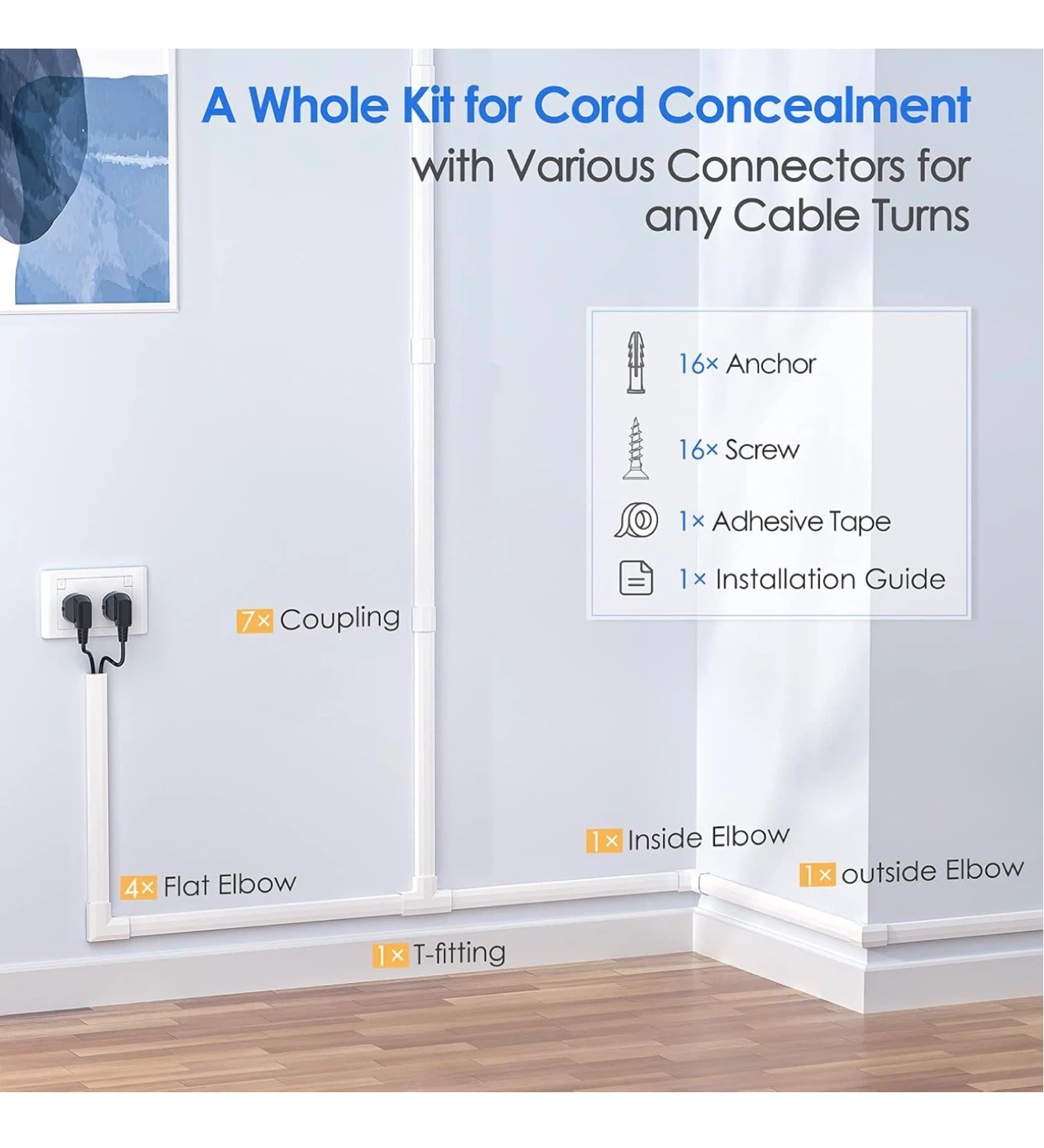 This is a Yecaye cable concealer kit designed to hide 3-4 cords. It's made of premium PVC, fire retardant, cuttable, and paintable. The kit includes various connectors for different cable turns and mounting hardware.