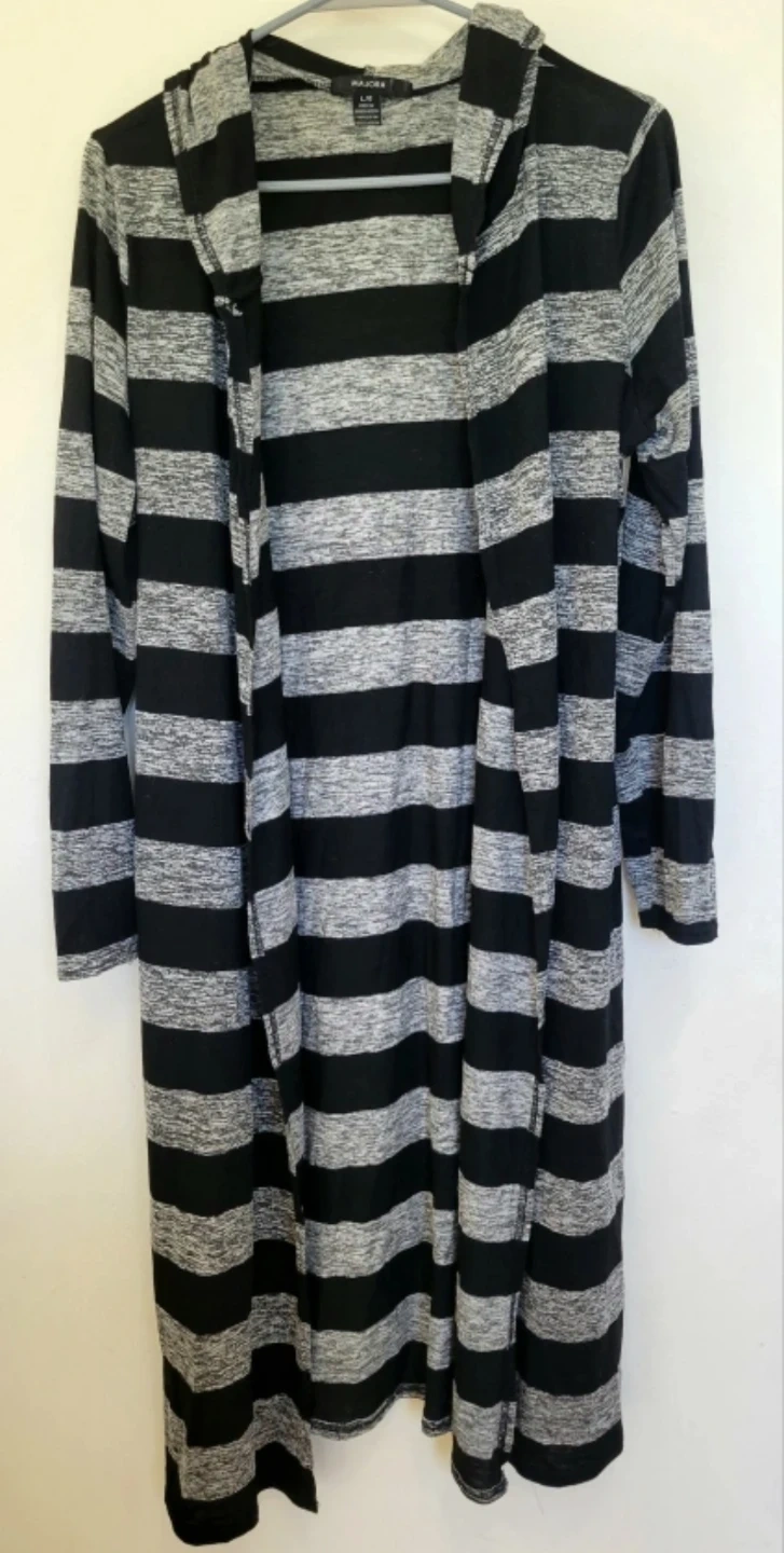 This Majora hooded cardigan features a black and grey stripe pattern. It's a size L/G and made in Bangladesh. It's an open-front design with long sleeves.