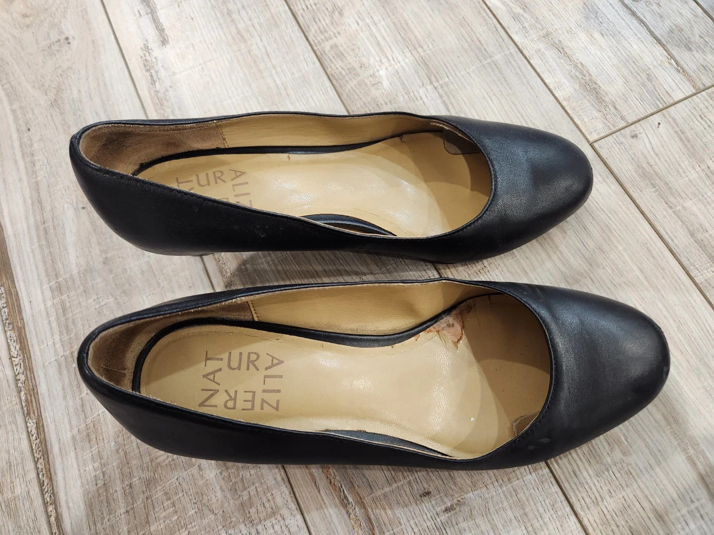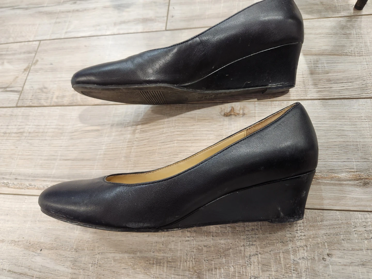 Black leather wedge heels by Naturalizer. These stylish shoes feature a classic design and a comfortable wedge heel.