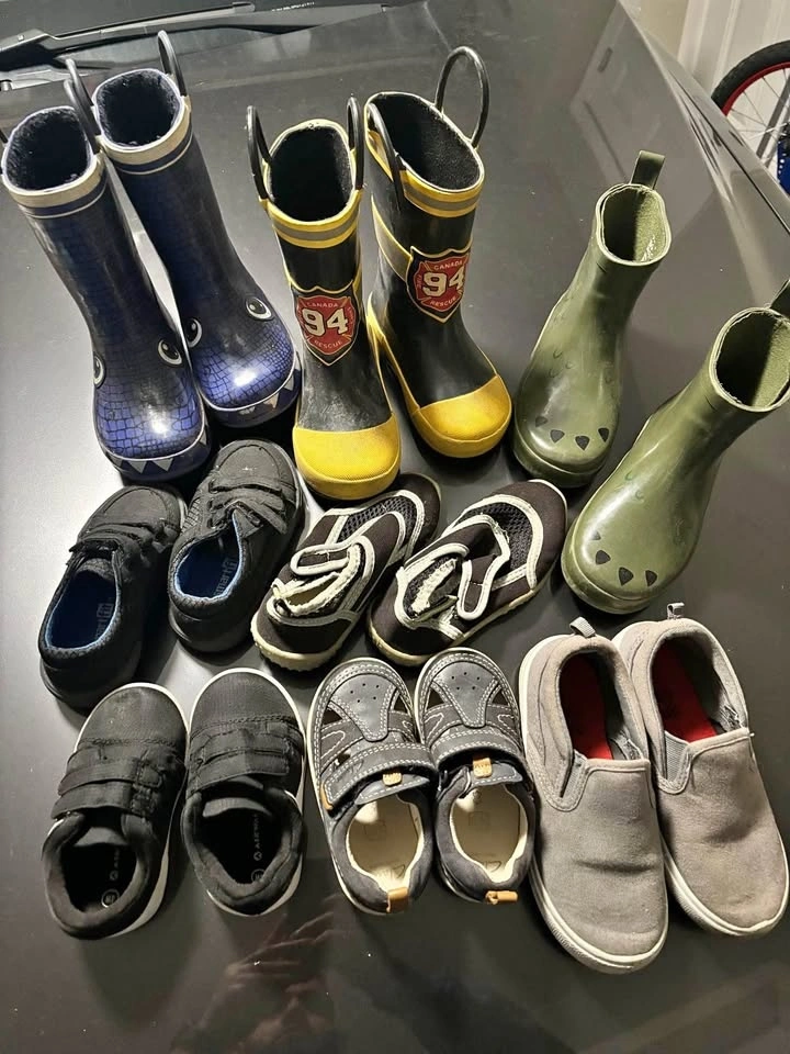 Various size toddler shoes & boots in good condition, a few pairs barely worn. Includes sizes Child 4, 5, 6, and more. Brands include Clarks and Airwalk. Styles include rain boots, water shoes, slip-ons, and sandals with Velcro closures. All in great condition, some are new. Pickup at King George and 62nd Ave.