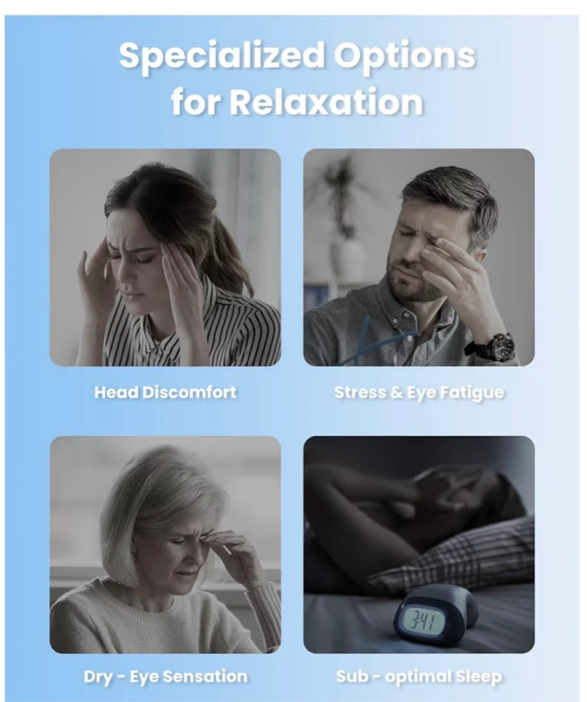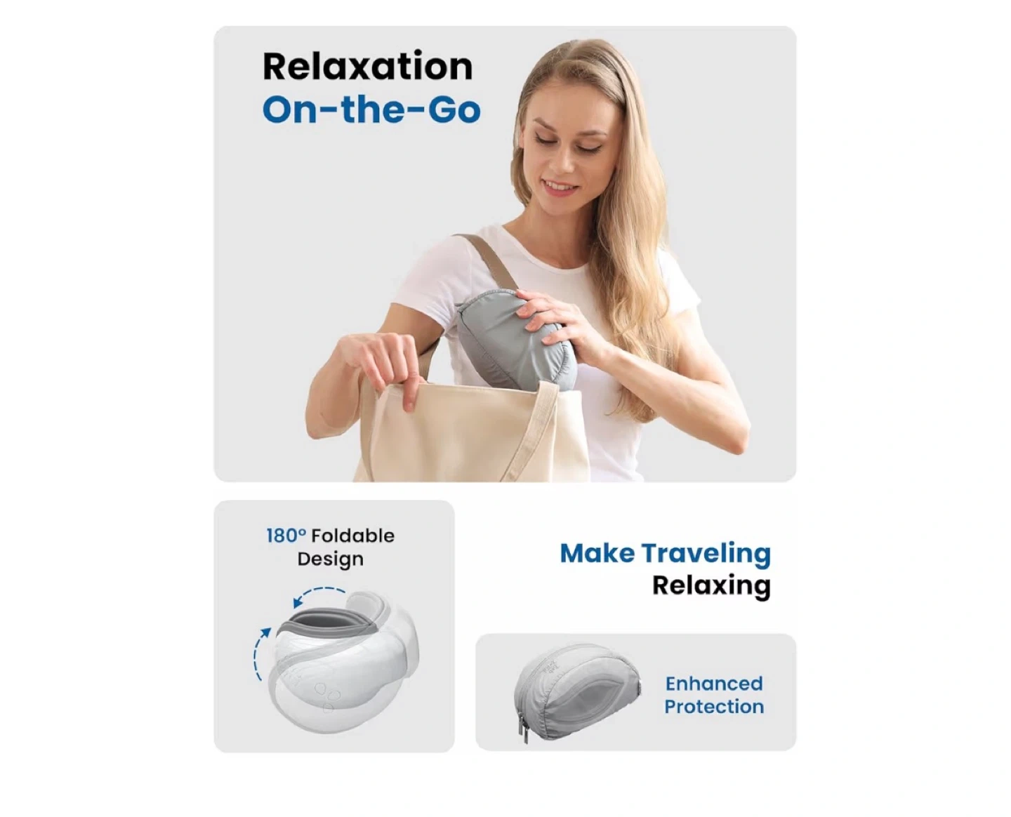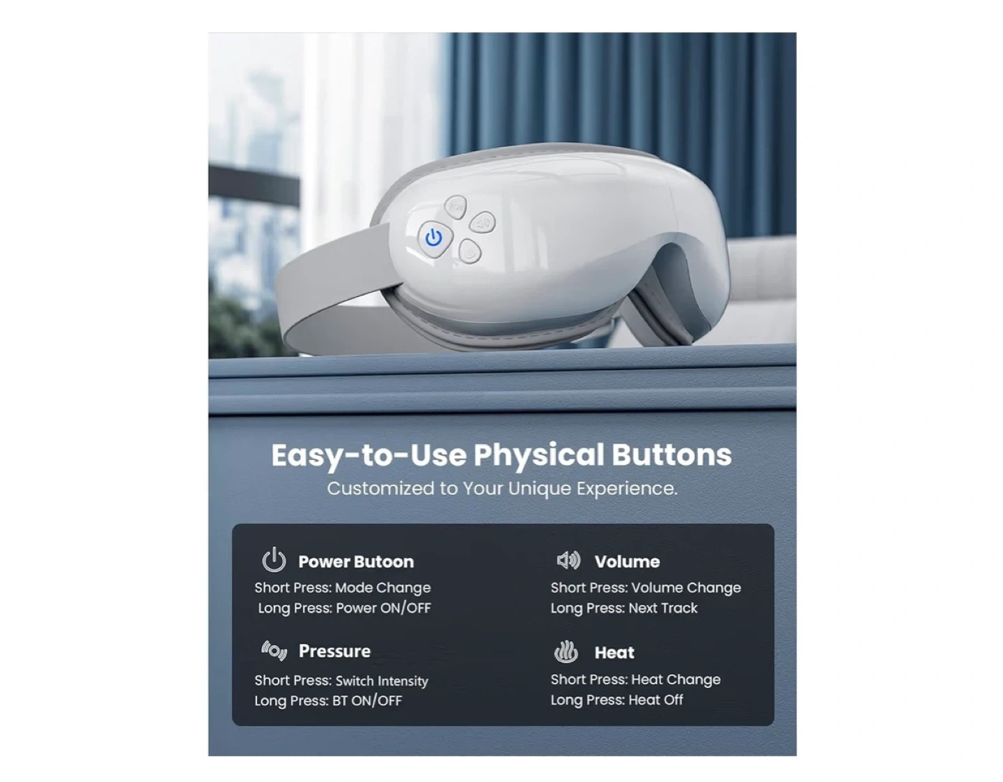 The Bob and Brad Eye Massager is designed for relaxation on-the-go! It features easy-to-use physical buttons for power, volume, pressure, and heat control. The 180° foldable design and enhanced protection make travelling relaxing. It comes with a user manual and a sleeping mask, travel bag and the box is included