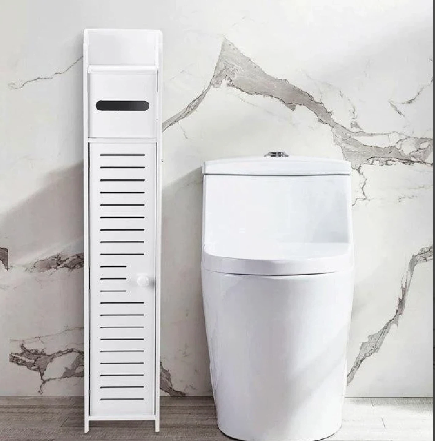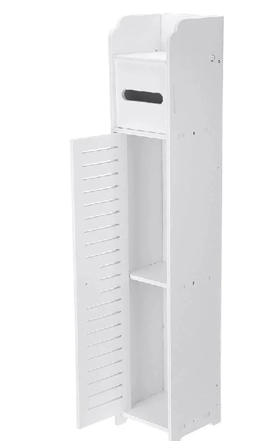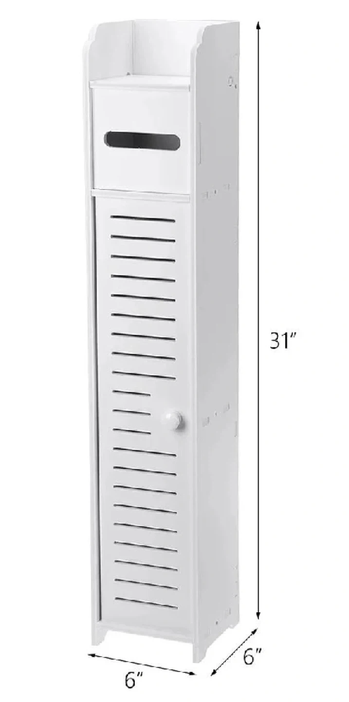 This slim storage cabinet is white and 31 inches tall. It's 6 inches wide and 6 inches deep, perfect for small spaces. It has a door and a shelf inside for storage.