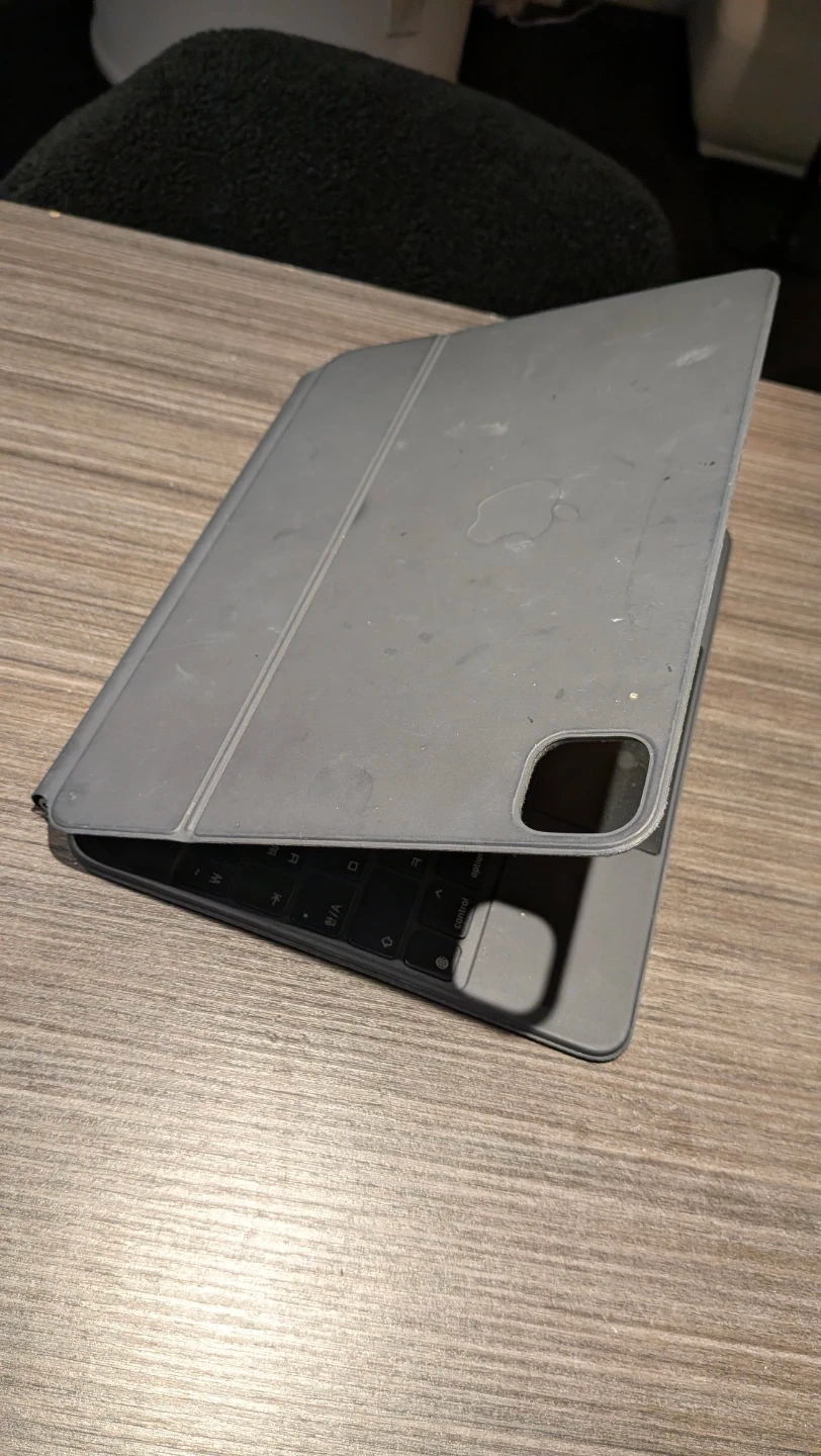 This is an Apple Magic Keyboard for iPad Pro. It's a grey, folio-style keyboard case with a built-in trackpad. It connects magnetically for a seamless user experience. Use it for typing and navigating your iPad.