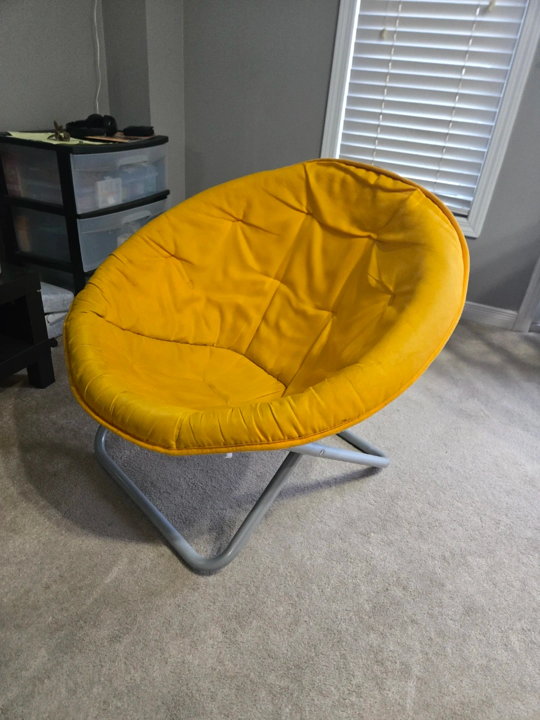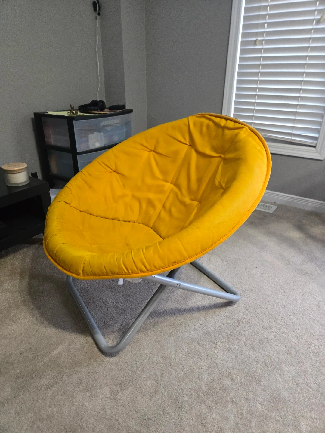 This is a yellow saucer chair with a metal frame. It's perfect for a reading nook or a casual seating area. The fabric is soft and the chair is lightweight for easy moving. It's a fun pop of color for any room!