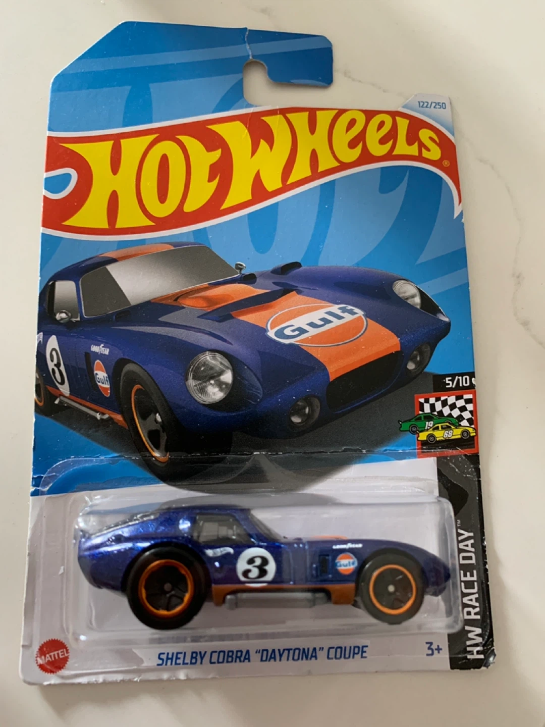This is a Hot Wheels Shelby Cobra "Daytona" Coupe. It's blue with orange accents and "Gulf" branding. This die-cast car is suitable for ages 3 and up.