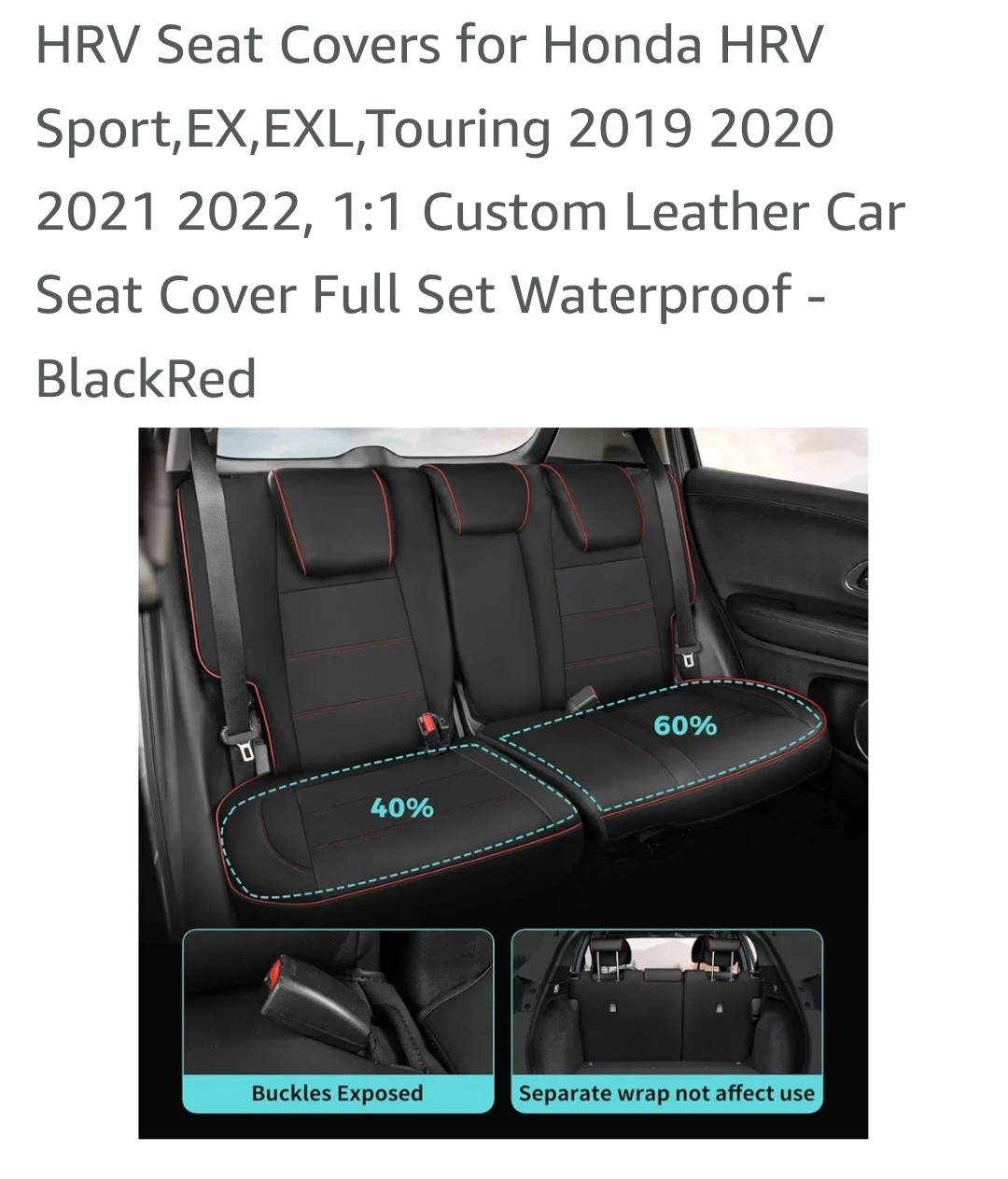 Custom-fit leather seat covers for Honda HRV Sport, EX, EX-L, and Touring models from 2019-2022. Waterproof and includes full set. Features include detachable headrests, storage pockets, and airbag compatibility. Black with red stitching.