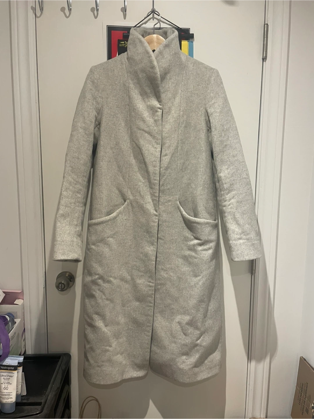 Selling a Wilfred Cocoon Coat in a lovely neutral white! It's a size small and made of a cozy material, perfect for the cooler weather. The coat has a stylish, minimalist design that goes with everything.