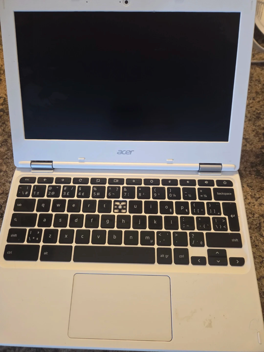 White Acer Chromebook CB3-132 model. It includes the charger and power adapter. The 'G' key cap is missing.