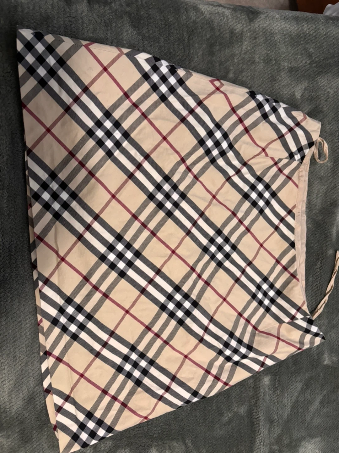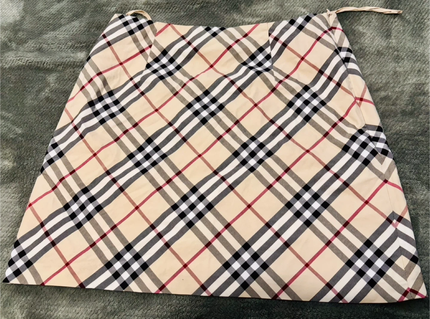 Classic Burberry Nova Check skirt. Features the iconic beige, red, black, and white plaid pattern. Drawstring waist for an adjustable fit.