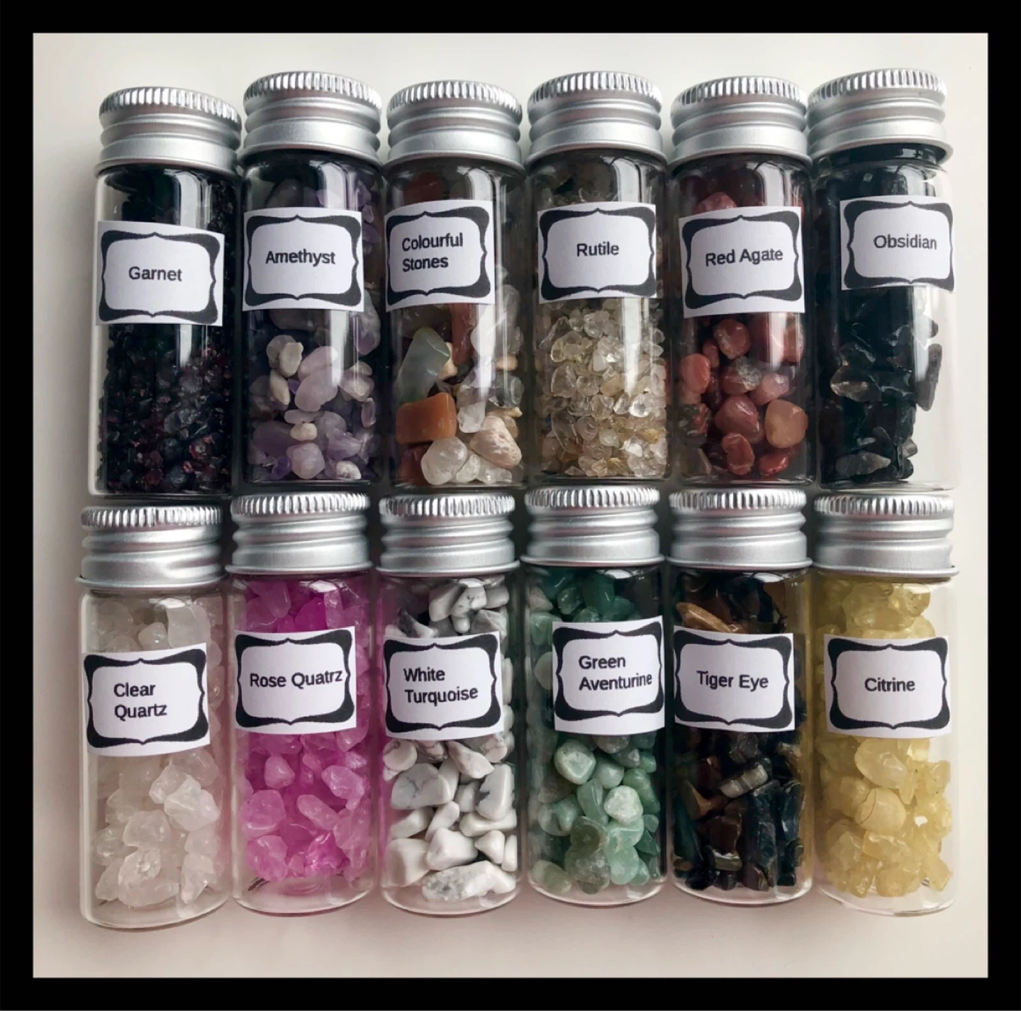 This set includes twelve small jars filled with various crystal chips. Types include Garnet, Amethyst, Colourful Stones, Rutile, Red Agate, Obsidian, Clear Quartz, Rose Quartz, White Turquoise, Green Aventurine, Tiger Eye, and Citrine. These are great for crafts or collecting!