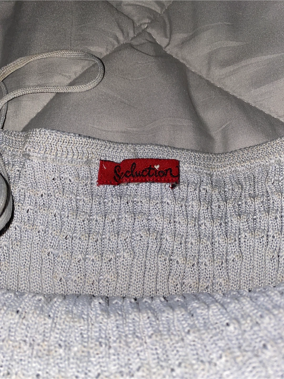 This is a Seduction knit tank top. It's light blue with a textured pattern and ruffled hem. Straps are adjustable.
