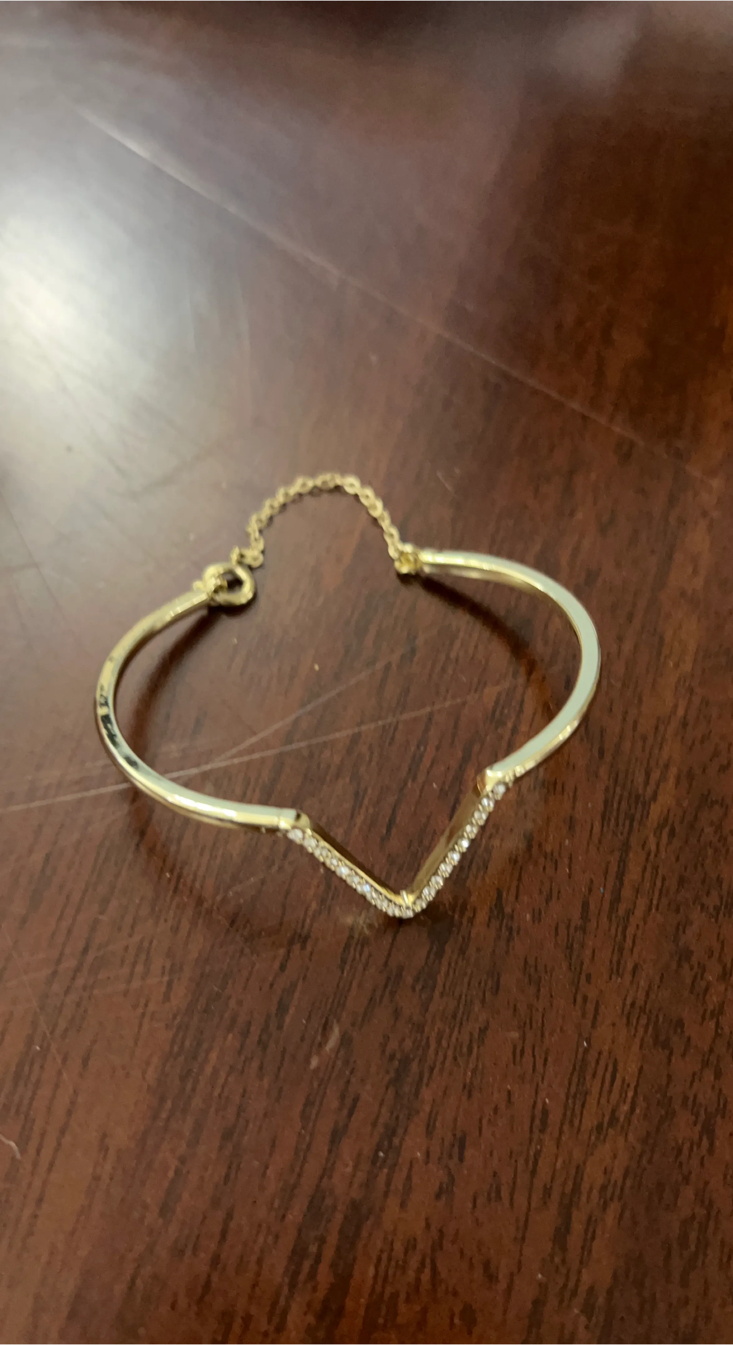 This gold tone cuff bracelet features a V-shaped design with sparkling crystals. It has a delicate chain for closure. A lovely accessory for any occasion!