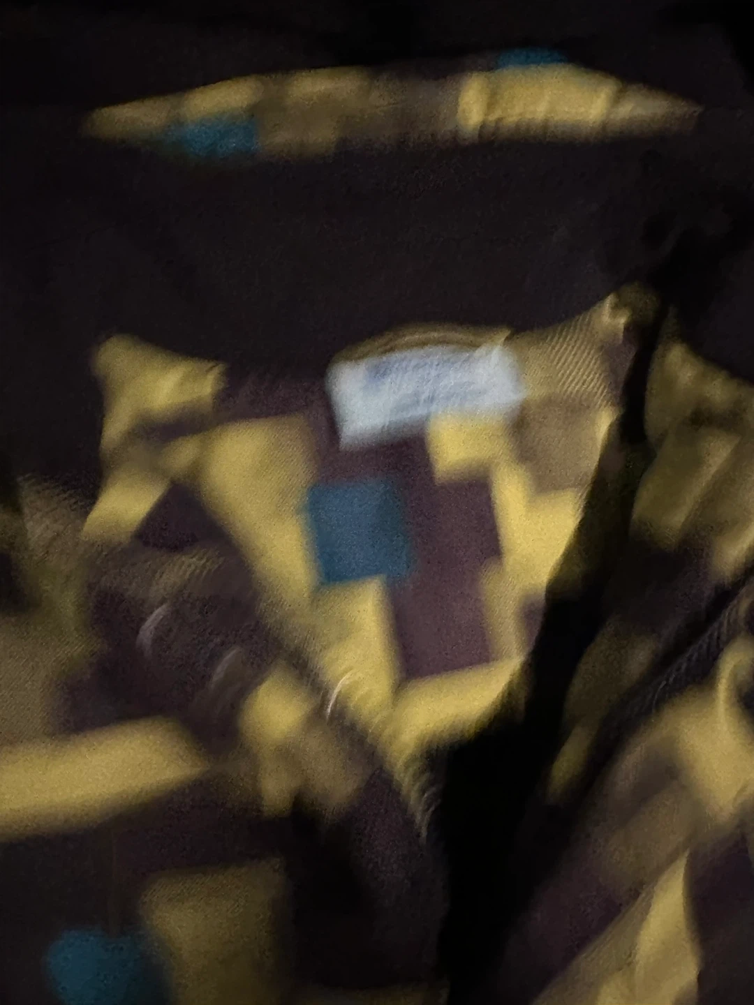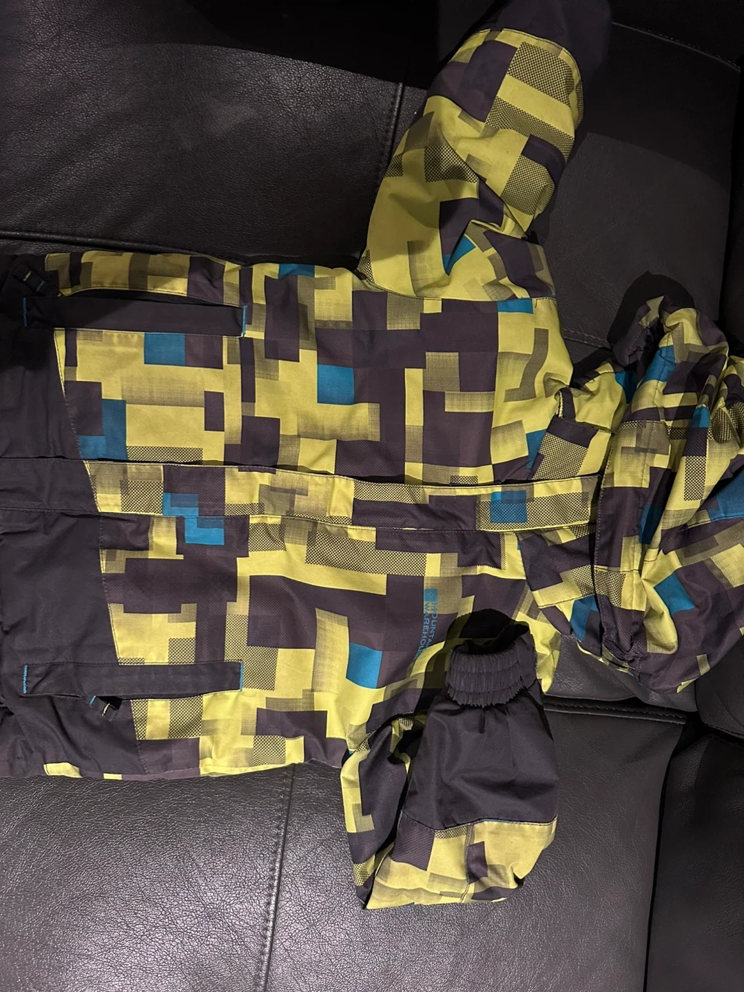 Selling a Mountain Warehouse kids' winter jacket. It's in great condition and perfect for keeping your little one warm during the cold months. The jacket features a unique geometric pattern in shades of green, blue, and black.