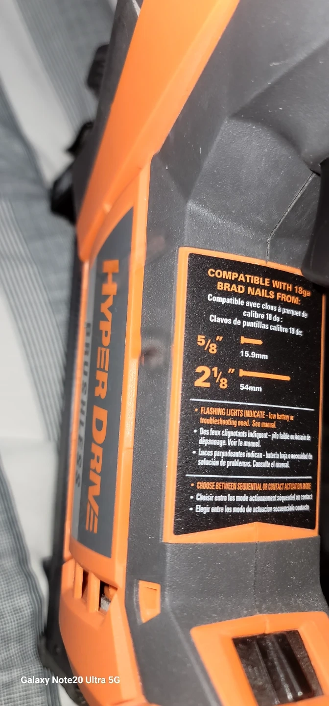Hello im selling my RIDGID HyperDrive 18 Ga brad nailer. It's compatible with 18 gauge brad nails from 5/8" to 2-1/8" long. The tool features brushless technology for efficient operation. It can be set to sequential or contact actuation modes.