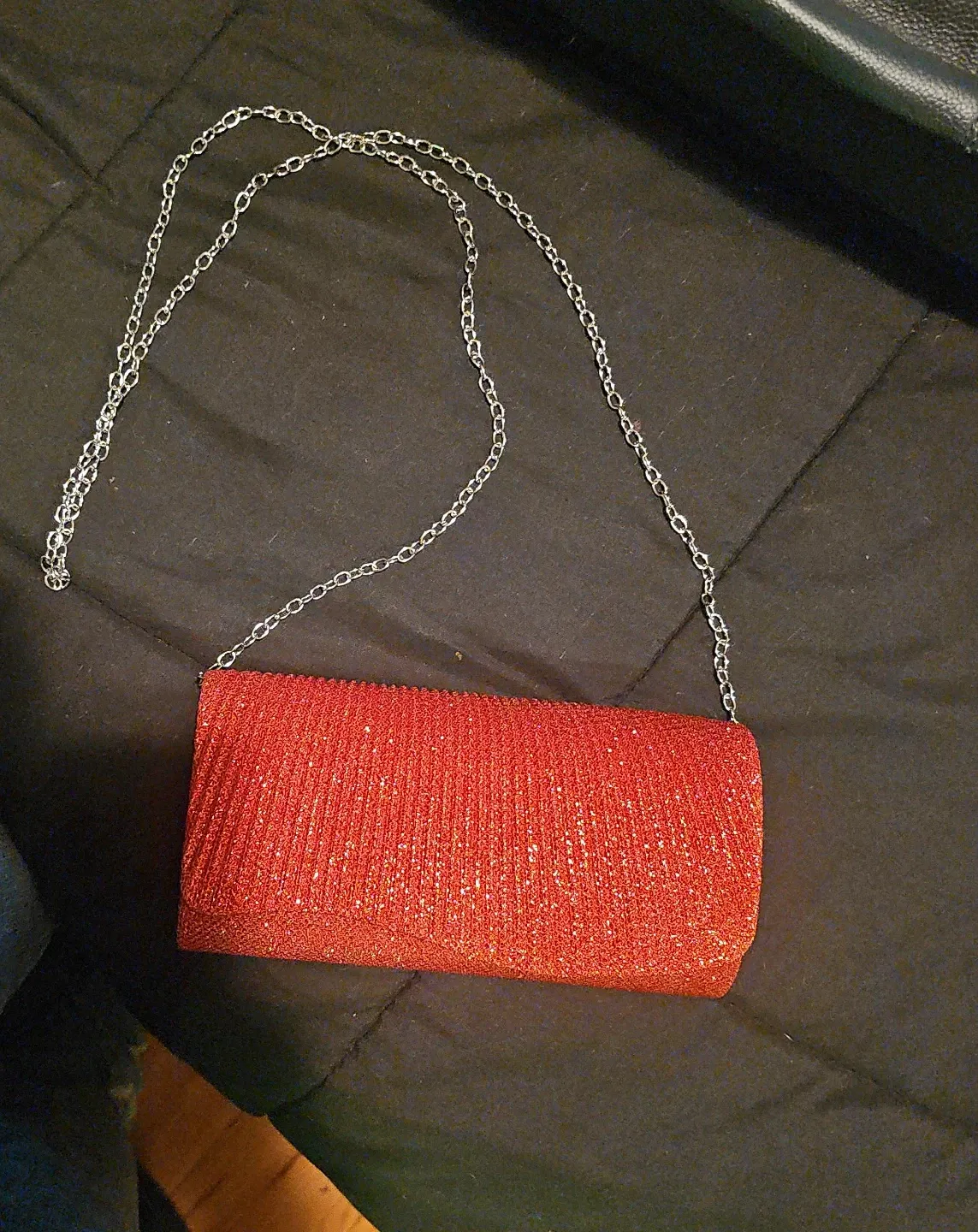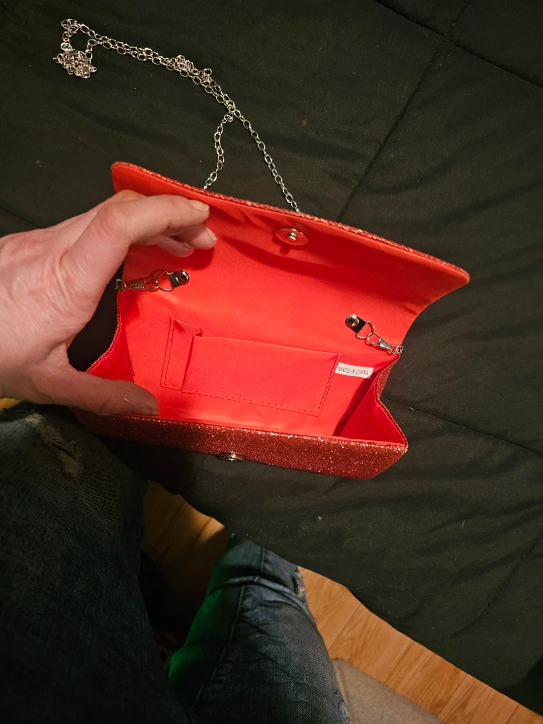 This sparkly red clutch purse is perfect for a night out. It has a silver chain strap for easy carrying. The interior features a small pocket for essentials.
