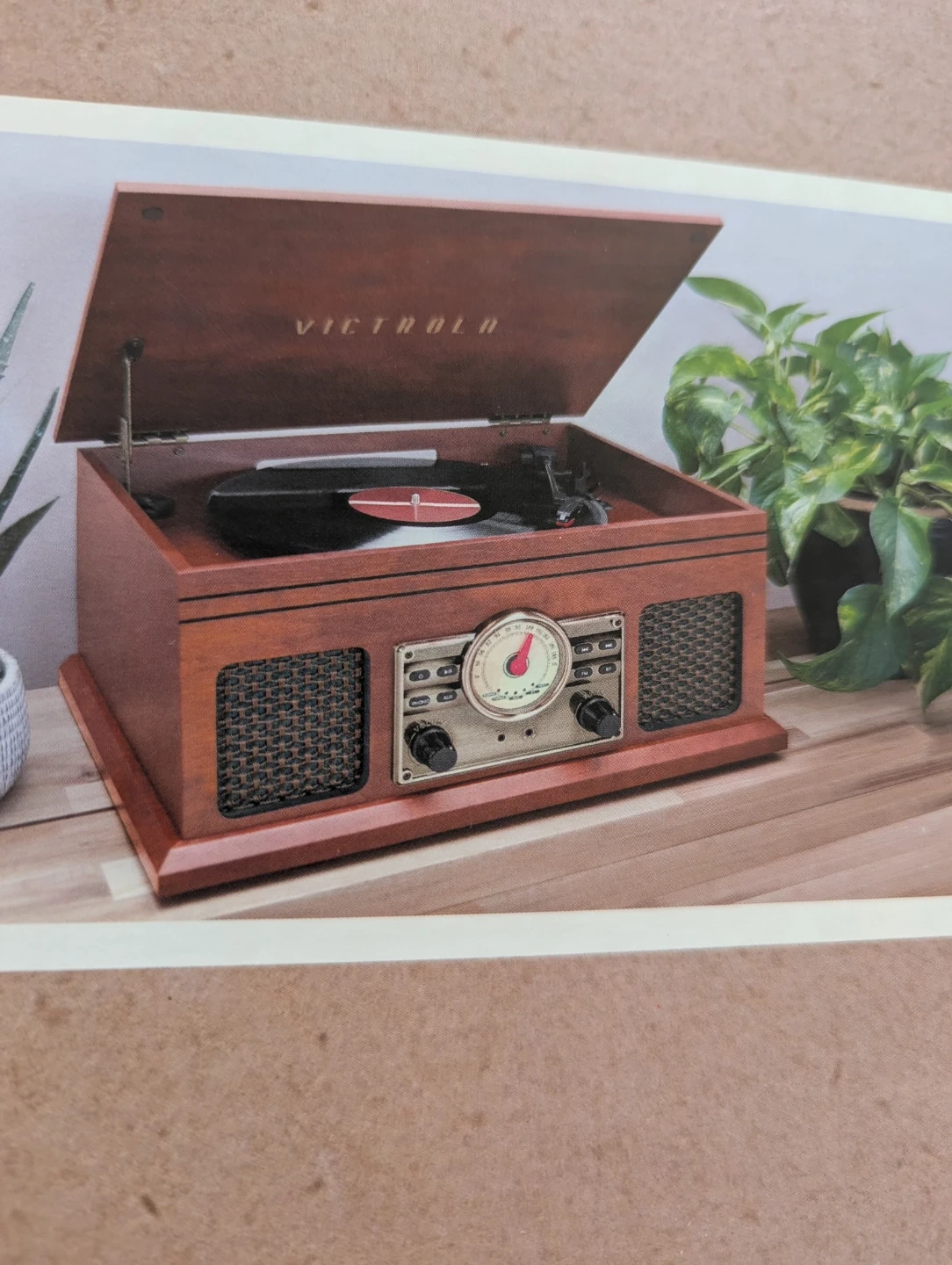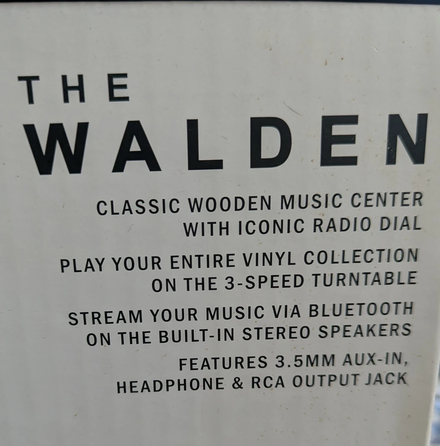 Classic wooden music center with an iconic radio dial. Plays your entire vinyl collection on the 3-speed turntable and streams music via Bluetooth on the built-in stereo speakers. Features 3.5mm aux-in, headphone & RCA output jack.