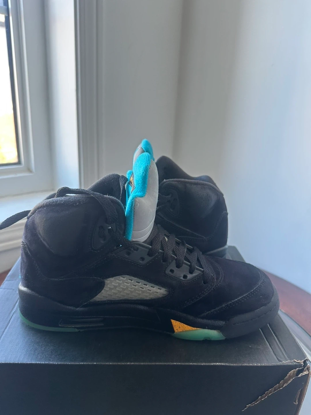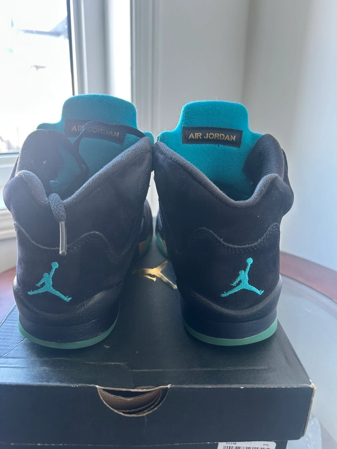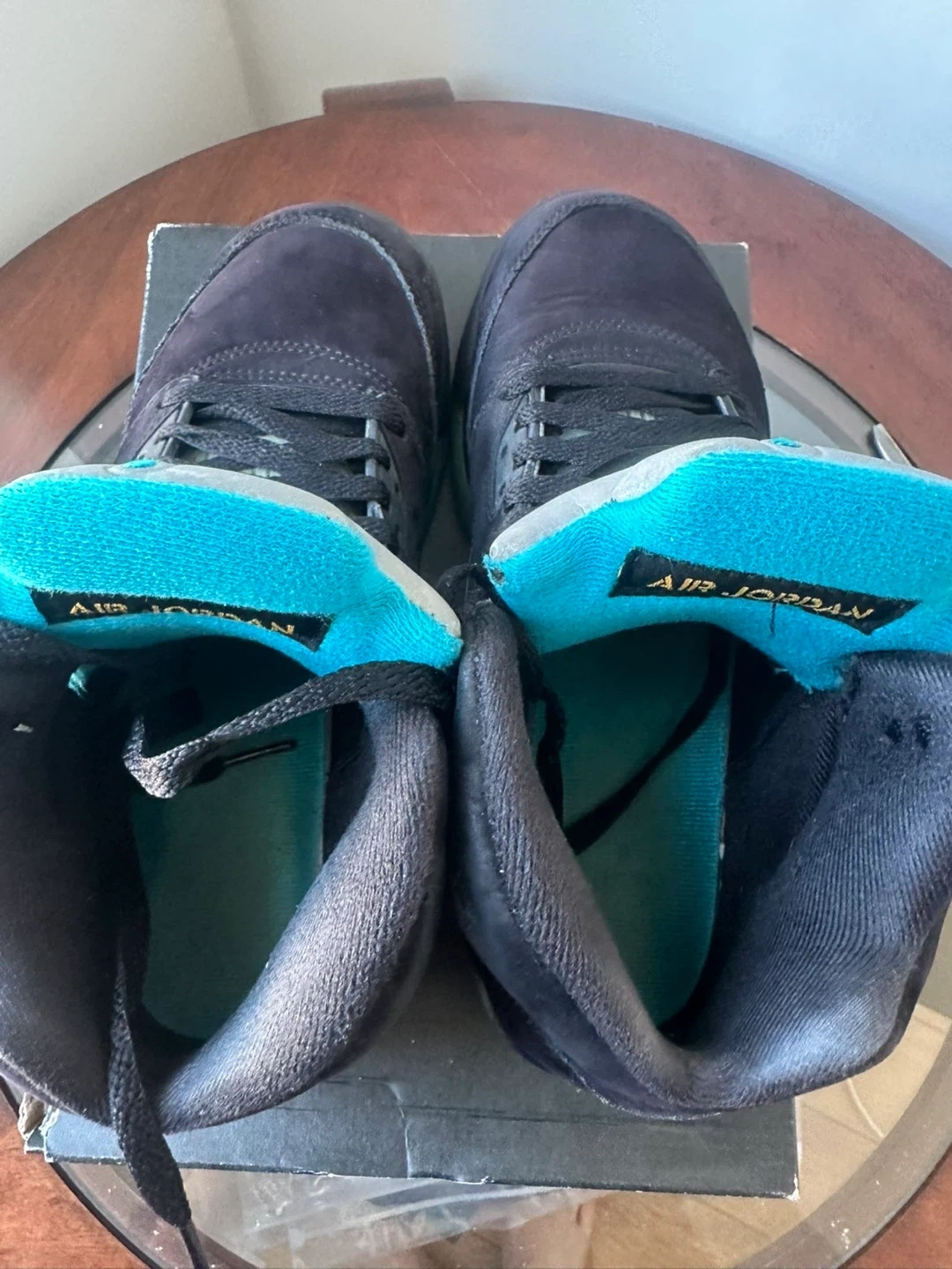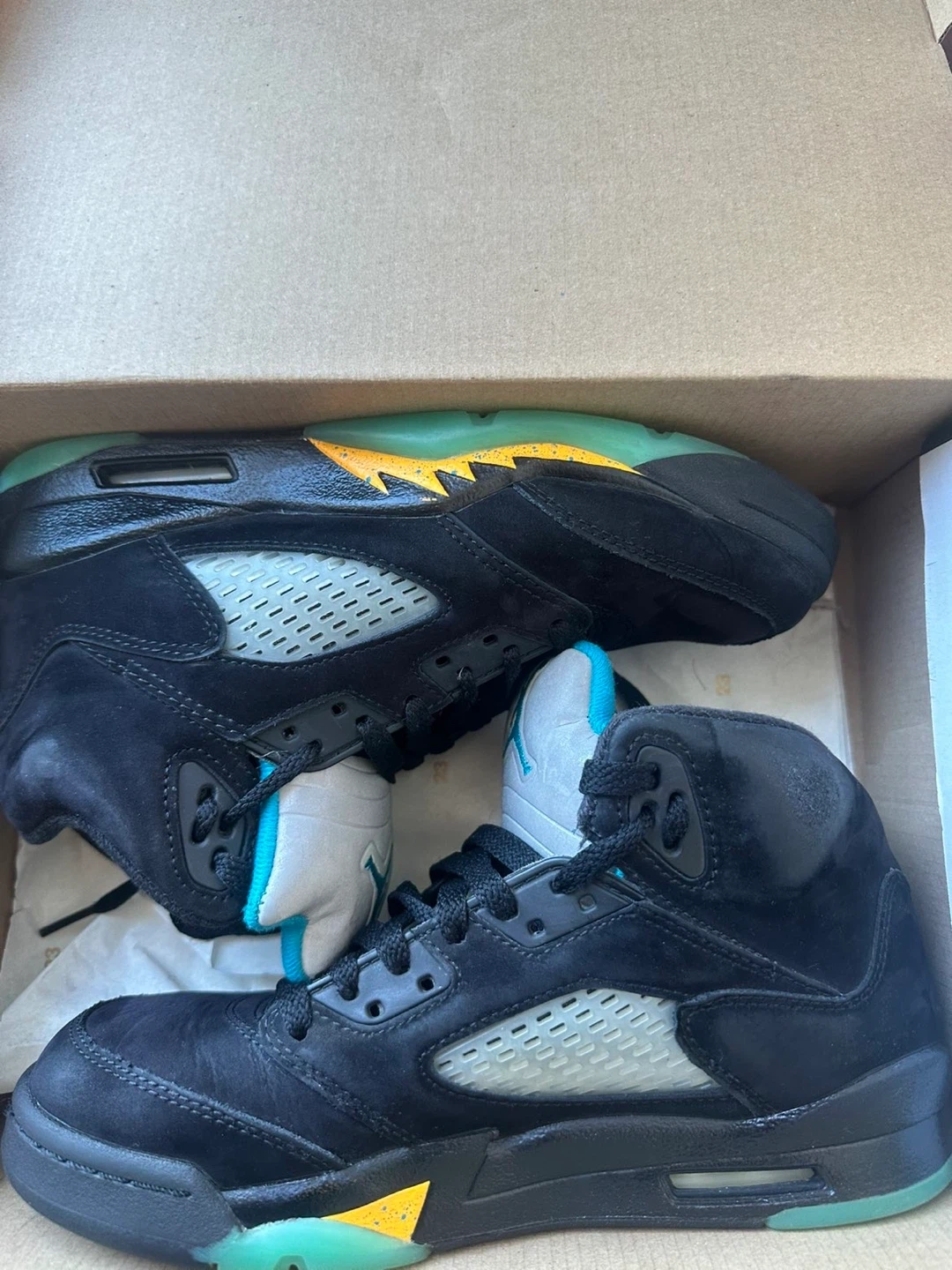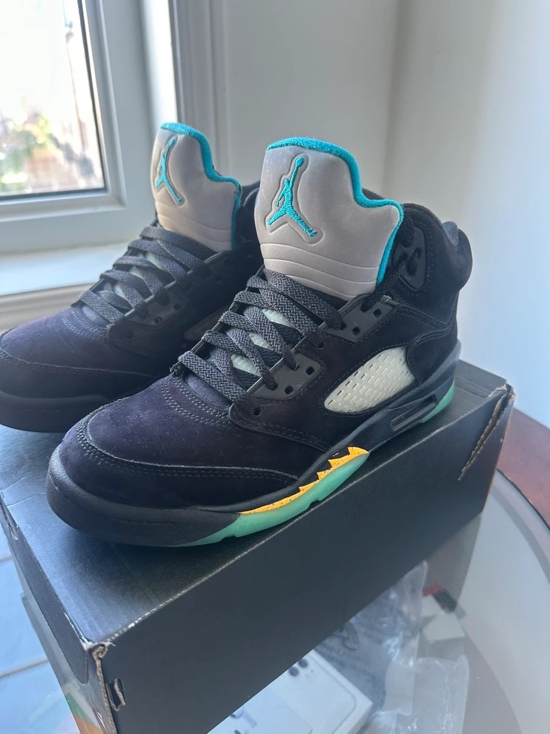 Here are some Air Jordan 5 Retro sneakers in black and island green. They come with the original box. The shoes are in great condition and ready for a new home!